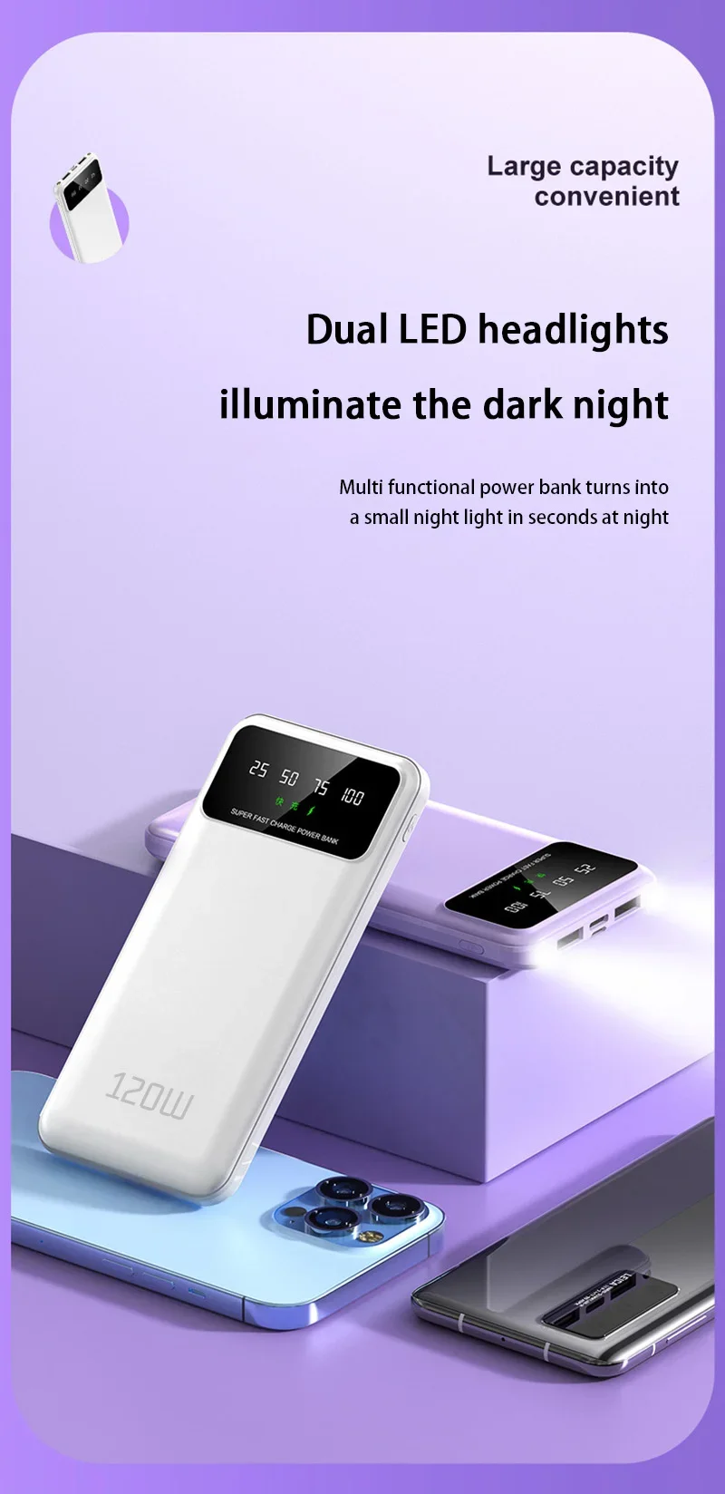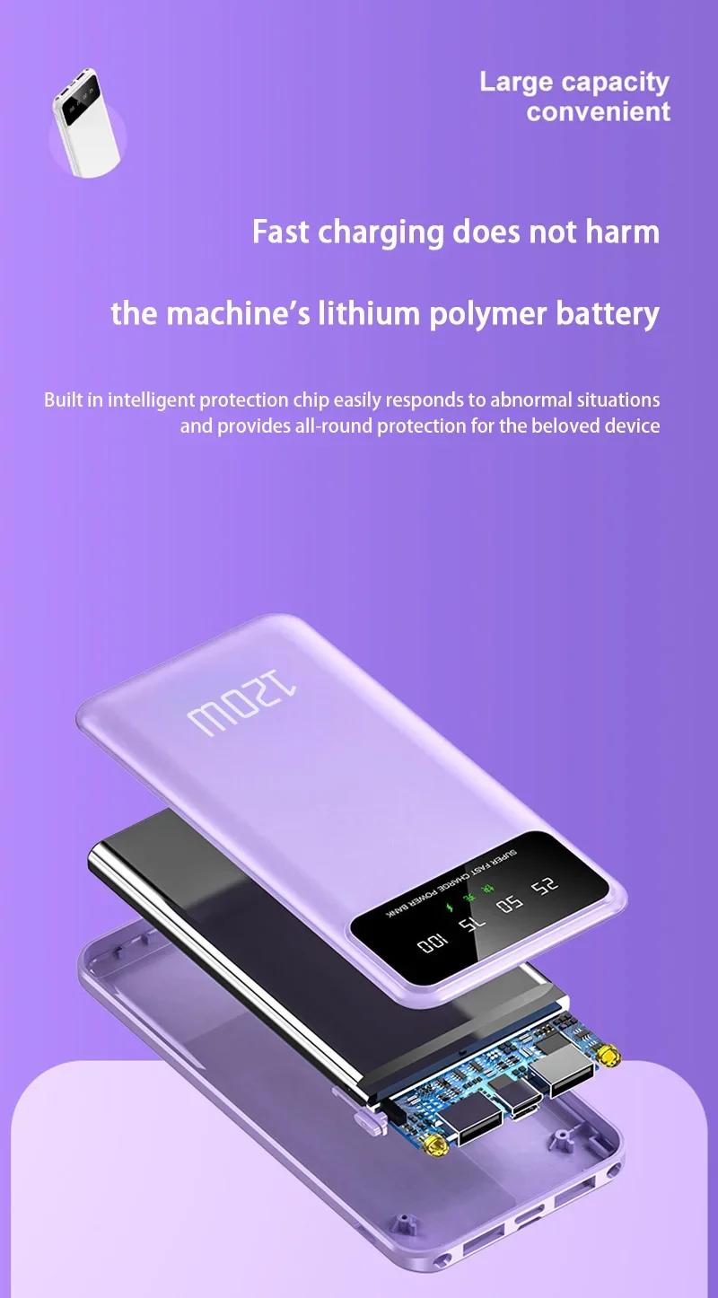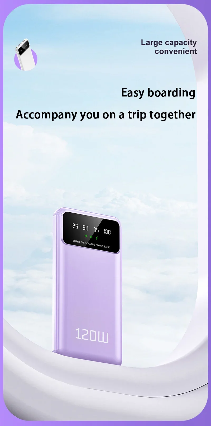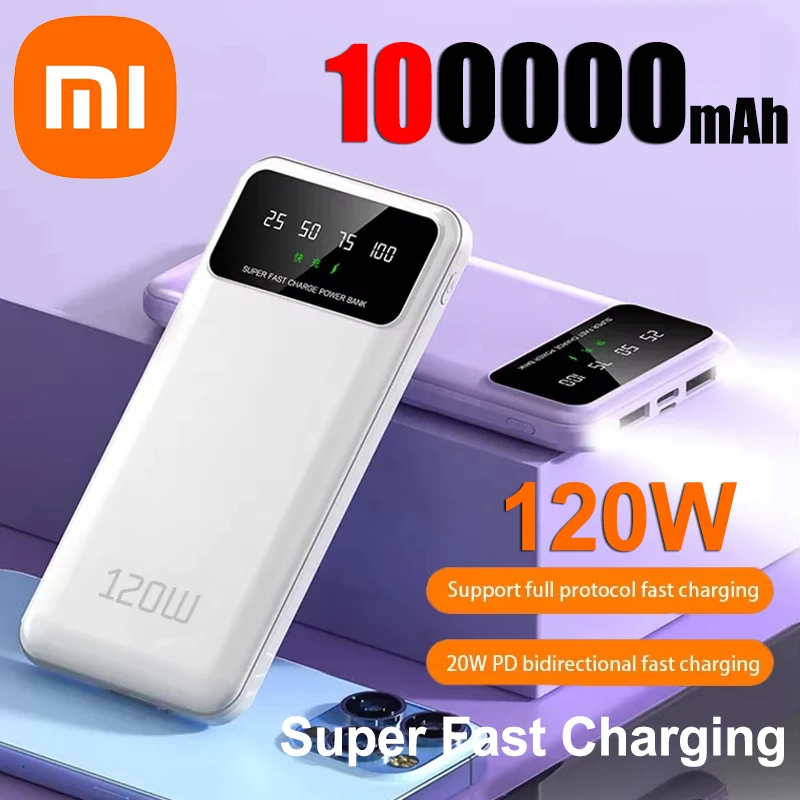 Specifications: Battery Capacity: 100000mAh Fast Charging: 120W Super Fast Charging Input: PD18W; 5V/3A; 9V/2A;12V/1.5A Output: PD22.5W'4.5V/5A;9V/2A;12V/1.5A Size: 138*68*15mm (30000mAh), 138*68*28mm (50000mAh), 138*68*30mm (100000mAh) Color Options: Black, White, Purple, Pink Features: **Unmatched Power and Portability** The Xiaomi 100000mAh Power Bank is a portable powerhouse designed to keep your devices charged on the go. With a massive capacity of 100,000mAh, this power bank is more than capable of charging your smartphone multiple times or providing a substantial boost to larger devices like tablets. Its sleek design ensures that it fits comfortably in your pocket or bag, making it an ideal companion for travelers, students, and professionals alike. **Ultra-Fast Charging Technology** This power bank is equipped with 120W Super Fast Charging technology, allowing for rapid power-ups that are up to 4 times faster than standard chargers. The dual USB outputs enable you to charge two devices simultaneously, while the PD 20W Two-Way Fast Charging feature allows for quick charging of both your power bank and your devices. The intelligent power management system ensures that your devices are charged safely and efficiently, preventing overcharging and overheating. **Durable and Smart Safety Features** Crafted with a durable build, the Xiaomi 100000mAh Power Bank is designed to withstand the rigors of daily use. The dual LED lights provide visibility in low-light conditions, while the LED digital display keeps you informed of the power levels. The power bank is equipped with smart safety features, including overcharge, overheat, and short-circuit protection, ensuring that both your devices and the power bank remain safe during use. Whether you're at home, in the office, or on the go, this power bank is a reliable companion that keeps you connected and productive.