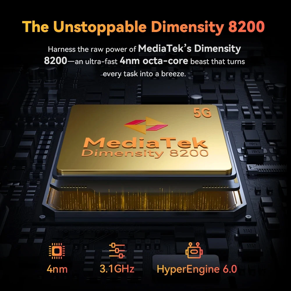 Harness the raw power ofMediaTek’s Dimensity 8200—an ultra-fast4nm octa-core beast that turns every task into a breeze.