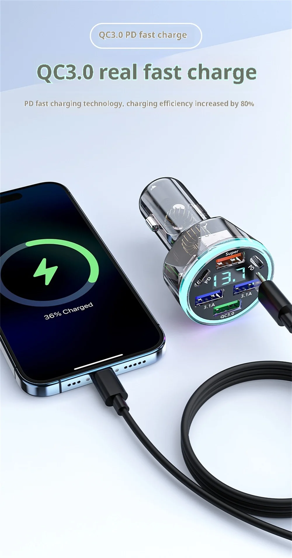 USB Car Charger 66W Multiport Digital Display Fast Charging Mobile Phone Charger Adapter in Car For iPhone Xiaomi Samsung Huawei
