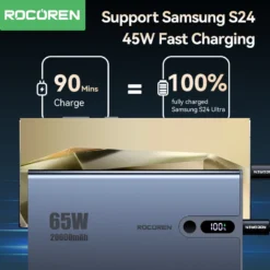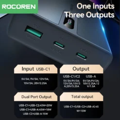 Specifications: Material: Aluminium alloy + plastic Battery Type: Lithium Battery Capacity: 20000mAh/14.8V/74Wh Input: USB-C1: 5V-3A; 9V-3A; 12V-3A; 15V-3A; 20V-2.25A Output: USB-C1: 5V-3A; 9V-3A; 12V-3A; 15V-3A; 20V-3.25A USB-A Output: 5V-3A; 9V-2A; 10V-2.25A/12V-1.5A USB-C1+USB-C2: 45W+20W USB-C2+USB-A: 15W USB-C1+(USB-C2+USB-A) Output: 45W+15W Features: |Anker 65w Power Bank|Baseus 65w Power Bank|Ugreen 65w Power Bank| **Durable Design and High-Capacity Power** The Rocoren 65W 20000mAh Power Bank is not just a portable charger; it's a powerhouse that stands out in the market with its robust aluminium alloy and plastic construction. This sleek design ensures durability and protection for the internal components, making it a reliable companion for your on-the-go lifestyle. With a substantial capacity of 20000mAh, this power bank can charge your devices multiple times, ensuring you stay connected and productive throughout the day. **Versatile Charging Capabilities** The Rocoren Power Bank is engineered to cater to a wide range of devices, from smartphones to laptops. It features multiple USB-C and USB-A ports, offering versatile charging options. The USB-C1 port supports up to 65W, allowing for rapid charging of devices like the iPhone 16 Pro Max and Xiaomi. The USB-A port is compatible with a variety of devices, providing a 15W output for quick charging. The power bank's intelligent charging technology detects your device's power requirements and delivers the optimal charge, ensuring your devices are always ready to go. **Travel-Ready and Eco-Friendly** This power bank is not just about power; it's also about convenience and sustainability. The lightweight design makes it easy to carry in your bag, while the compact size ensures it fits in any pocket or purse. It's an eco-friendly choice, as the lithium battery offers a longer lifespan and is more environmentally friendly compared to traditional batteries. Whether you're heading to the office, embarking on a road trip, or enjoying a weekend getaway, the Rocoren Power Bank is your reliable companion, ensuring your devices stay powered up without the need for frequent recharging.