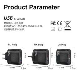 65W 5Ports USB Charger PD Charging Adapter For Xiaomi iPhone Samsung Vivo Mobile Phone Plug Charging QC 3.0 Wall Charger – 509