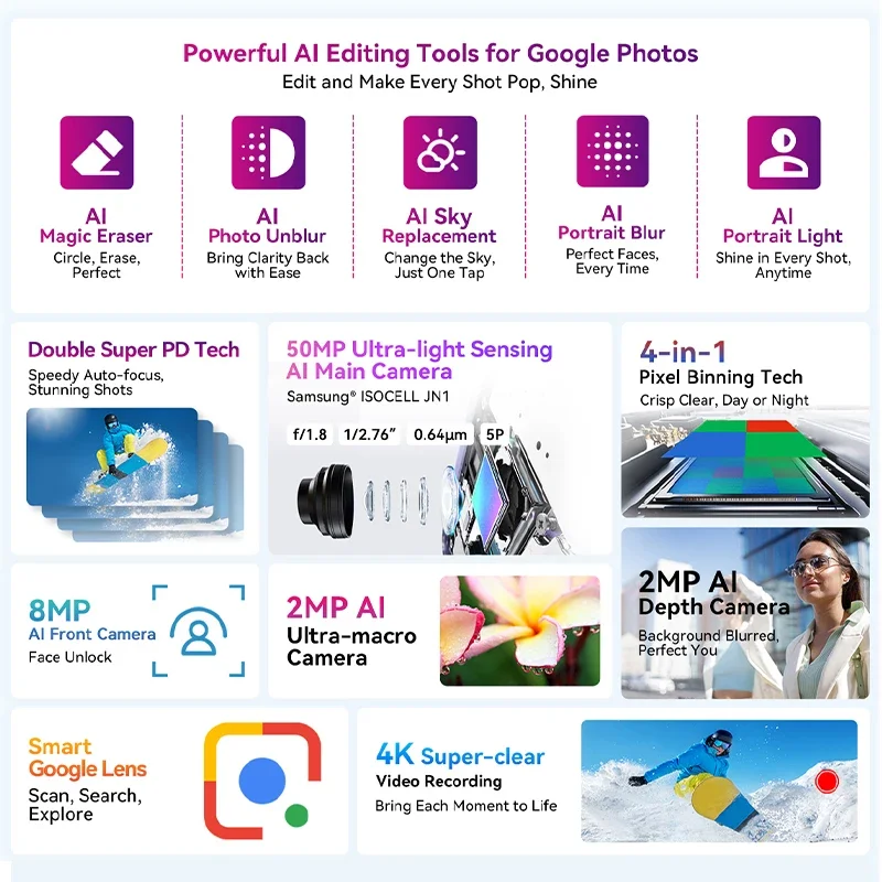 50MP Ultra-light Sensing JN1|5G T820 Multitasking Processor