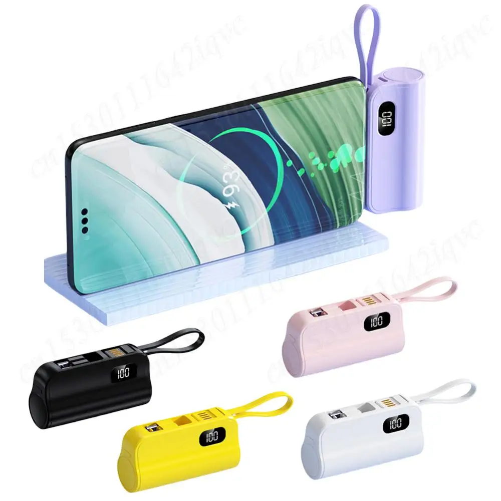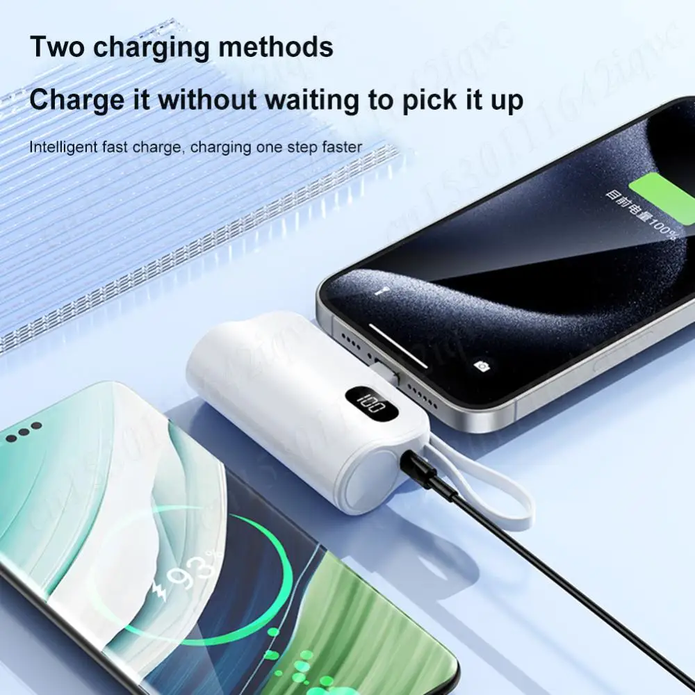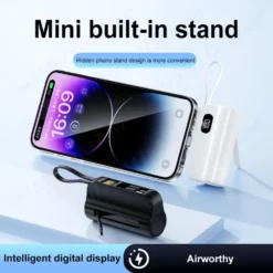 4. Three-in-One Functionality: The mini capsule powerbank comes with a built-in invisible stand for hands-free viewing while charging, an integrated cable to eliminate the need for extra cords, and a dual-output plug to charge two devices simultaneously.