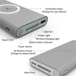 Support Fast Wireless Charging at Up to 5V 1A Fast Charger USB Port Power Bank Wireless charging USB charge Micro usb input Type-C input Charge the Power Bank You to Charge Your Phone While Charging Your Deviceand Can Use the Wireless Charger for the Wireless Power Bank to Charge Product parameters: 1. Input voltage: 5V, 2A 2. Output voltage with the cable connected: 5V, 2.1A 3. Wireless charging current: 500 to 1000 mA 4. Wireless operating frequency: 110 – 205KHZ 5. Radiation distance: about 2 to 4 mm/ 0.07 – 0.16in 6. Charging power: 5 mW 7. Standby power: less than 30 mW Packing: 1 x Wireless Charger Power Bank 1 x Micro USB Cable