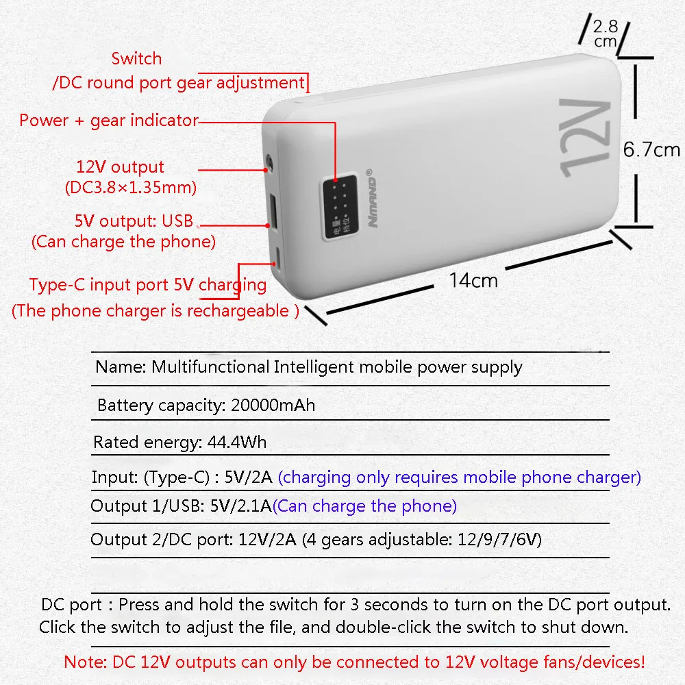 20000mah Power Bank 12V DC Output Portable Battery External Charging Variable Speed Charger For iPhone Air Conditioned Clothing