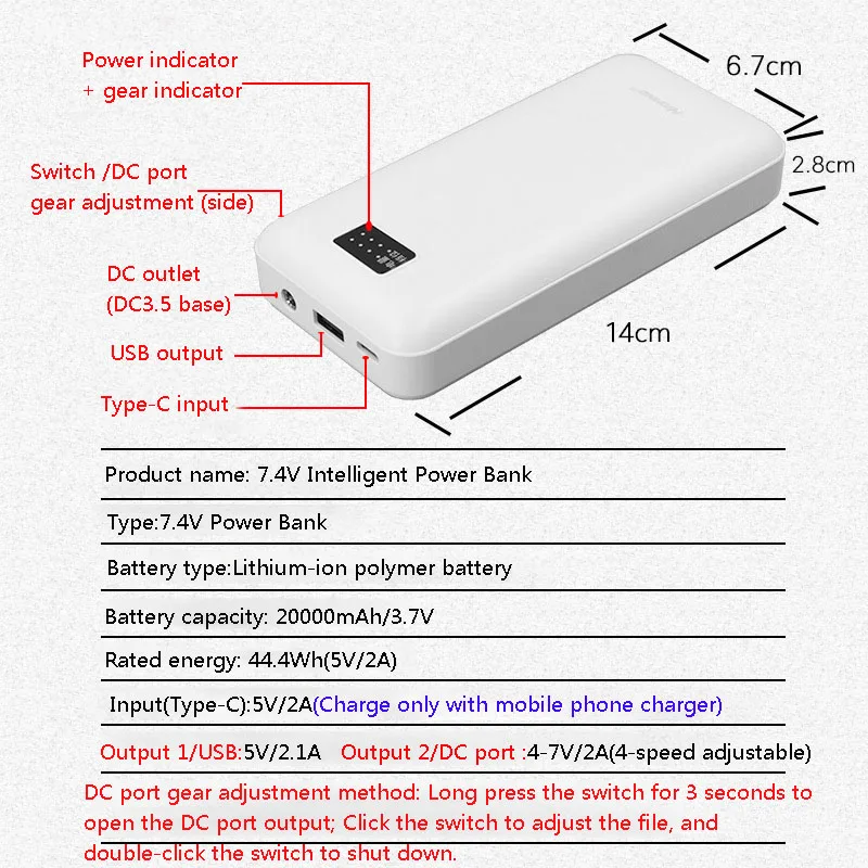 Designed for air conditioning suit/fan suit, designed with 12V/7.4V output DC3.8 x 1.35mm interface, providing 4 speed adjustment.20000 mAh large capacity, for scenes that require long working hours.