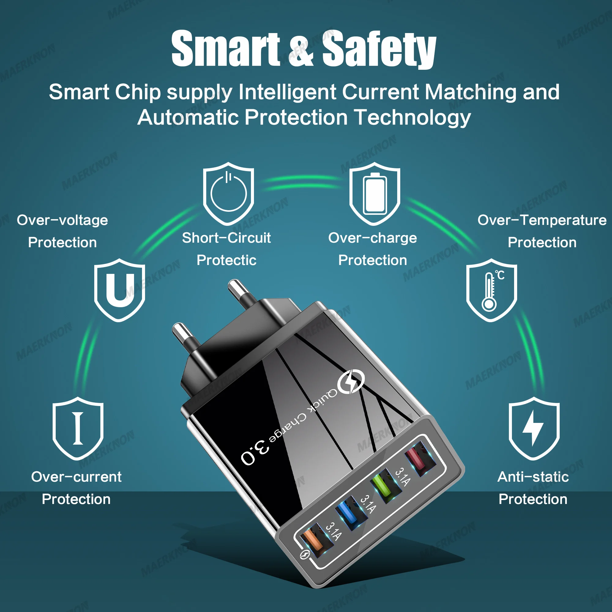 3.1A USB Charger 4 Ports Fast Charging QC 3.0 Wall Charger For Xiaomi iPhone 15 Samsung US/EU Mobile Phone Plug Travel Charger