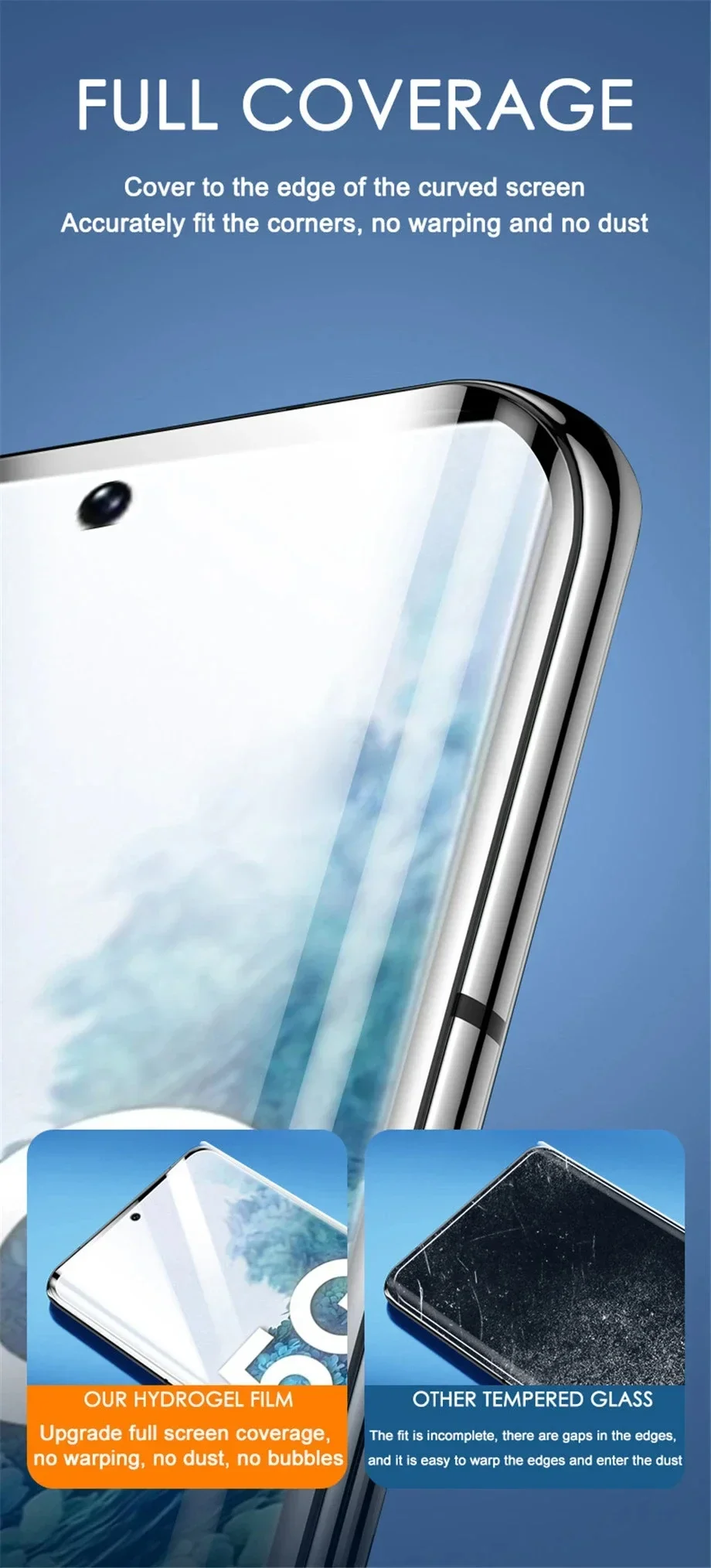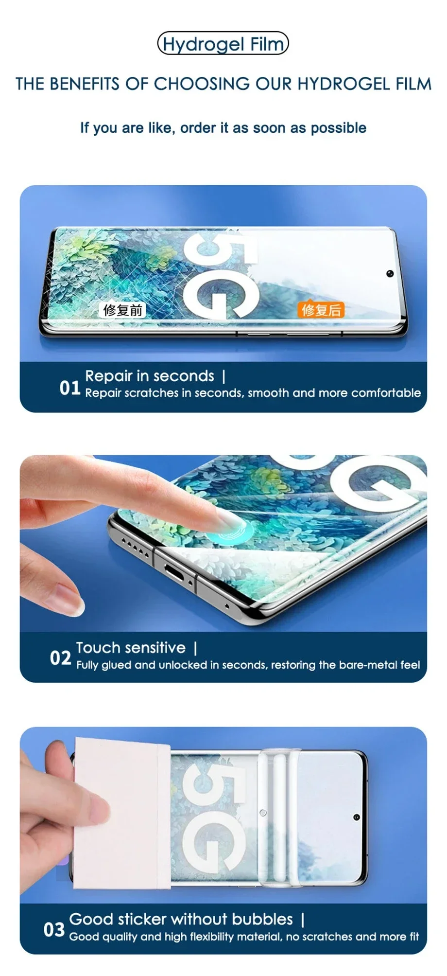 Specifications: Material: High-quality Hydrogel Film Quantity: 5 Pcs Compatibility: Samsung Galaxy S24, S23, S22 Ultra Plus, S21, S24 FE, Note 20 Ultra, A55, A54, A35, A14, A15 5G Design: Ultra-thin, HD Clear Installation: Easy-to-apply Hydrogel adhesion Protection: Scratch-resistant, impact-absorbent Features: |S24 Ultra Hydrogel Film|S23 Ultra Hydrogel Film|S24 Fe Hydrogel Film| **Unmatched Clarity and Protection** Discover the pinnacle of screen protection with our 5 Pcs Hydrogel Film for Samsung Galaxy S24, S23, S22 Ultra Plus, S21, S24 FE, Note 20 Ultra, A55, A54, A35, A14, A15 5G. Our Hydrogel Film is meticulously crafted to provide the highest level of clarity, ensuring that your device's screen remains unobstructed while offering superior protection against scratches and impacts. The ultra-thin design of the film is virtually undetectable, maintaining the original touch sensitivity and aesthetic appeal of your device. **Effortless Application and Durability** Installing our Hydrogel Film is a breeze, thanks to its unique Hydrogel adhesion that allows for a bubble-free application. The film is designed to adhere seamlessly to your device's screen, ensuring a perfect fit and a hassle-free experience. With its exceptional durability, this Hydrogel Film stands up to the rigors of daily use, offering long-lasting protection for your device's screen. Whether you're a busy professional or a tech-savvy individual, this film is an essential accessory to safeguard your investment. **Compatibility and Versatility** Our Hydrogel Film is tailored to fit a wide range of Samsung devices, including the latest models like the Galaxy S24 Ultra and S23 Ultra, as well as the popular S21 and S24 FE. The versatility of this product extends to the Note 20 Ultra and other A series models, ensuring that your device is protected regardless of its model. The film's HD Clear design ensures that your device's original aesthetic is preserved, making it an ideal choice for those who value both protection and style.