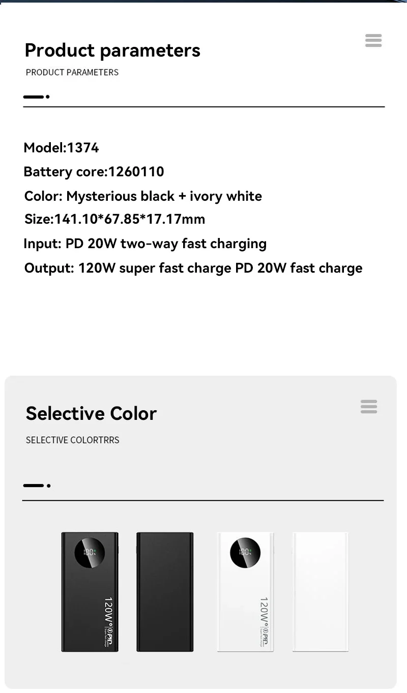 Specifications: Capacity: 50000mAh Charging Speed: 120W Super Fast Charging Size: Compact and Portable (about 141*68*17mm) Color Options: Sleek Black and Elegant White Compatibility: Multi-device with PD, QC, AFC, FCP, SCP protocols Display: LED Crystal Display for Power Monitoring Features: **Ultimate Power for On-the-Go Charging** The 50000mAh High Capacity Power Bank is the ultimate companion for your digital life. Whether you're a frequent traveler, a busy professional, or a gadget enthusiast, this power bank ensures that your devices are always powered up and ready to go. With its 120W super fast charging capability, you can recharge your smartphone, tablet, or other devices in record time, reducing unnecessary waiting and keeping you connected throughout the day. **Designed for Convenience and Safety** This power bank is not just about power; it's also about design and safety. Its compact size makes it easy to carry in your bag or pocket, while the dual USB fast output allows you to charge multiple devices simultaneously. The LED crystal display provides real-time information about your power levels, ensuring that you're always aware of your battery status. The power bank is crafted with high-quality lithium battery cells, offering an ultra-high conversion rate and stable discharge voltage for safe daily charging. **Versatile and Reliable** The 50000mAh High Capacity Power Bank is a versatile and reliable power solution for a wide range of devices, including iPhone, Samsung, Huawei, and Xiaomi. It supports multiple fast charging protocols, including PD, QC, AFC, FCP, and SCP, making it compatible with a vast array of smartphones and tablets. The power bank's classic two-color design adds a touch of elegance to its functionality, making it an ideal gift for friends, family, or yourself. Remember to remove the protective film on the screen before use for an optimal user experience.
