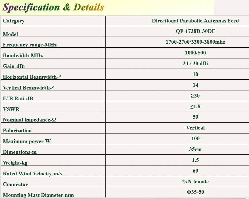 Specifications: Gain(dB): 2x30dBi Frequency Range: 1700-2700MHz, 3300-3800MHz Type: Dual Band, MIMO Compatibility: 5G STC ZAIN, Mobile Dish Grid Design: Feedhorn, Long Range Installation: Easy to set up Features: |5g Cell Repeater|Simrad Radar 4g| **Enhanced Connectivity and Coverage** The 5G 4G Antenna Feed is a cutting-edge solution for those seeking reliable and long-range cellular connectivity. With a dual band design spanning from 1700-2700MHz to 3300-3800MHz, this antenna ensures compatibility with a wide range of mobile devices and networks, including 5G STC ZAIN and Mobile Dish Grid systems. The impressive 2x30dBi gain provides a significant boost to signal strength, making it ideal for remote areas or locations with weak cellular signals. **Robust and Versatile Installation** The feedhorn design of this antenna is not only aesthetically pleasing but also engineered for durability and performance. The easy-to-install setup means that users can quickly and efficiently set up their communication systems, whether for personal or professional use. The lightweight and compact design make it suitable for various scenarios, from rural homes to commercial installations, ensuring that users can enjoy consistent and strong cellular signals wherever they are. **Reliable and User-Friendly** This antenna is not just about performance; it's also about user experience. The long-range capabilities of the antenna are complemented by its user-friendly features, such as the ability to monitor signal strength with apps like T Mobile Signal Strength and Bingfu 4G LTE Antenna Review. The one-year warranty and the option for an exchange or refund within 7 days provide peace of mind for customers, ensuring that they can rely on this antenna for their communication needs without worry.