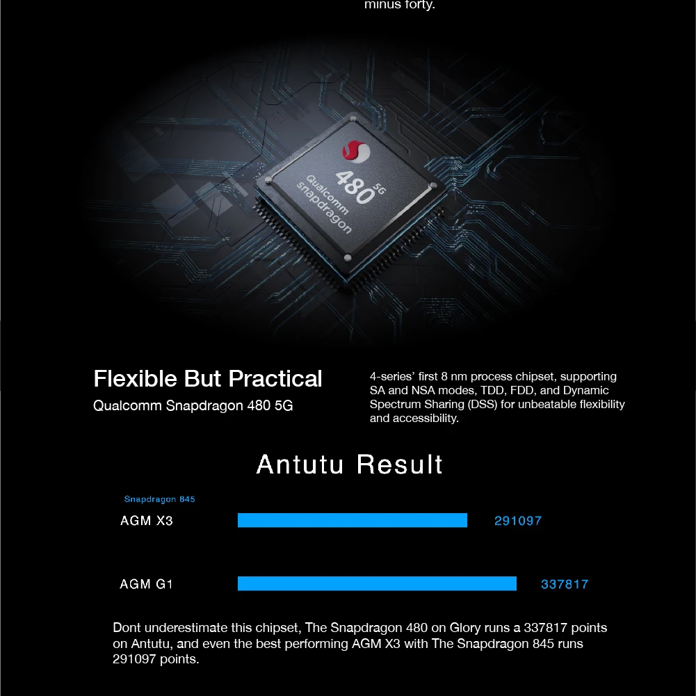 OS: Android 11 CPU: Qualcomm Snapdragon 480 5G RAM: 8GB Display: 6.53 inch ROM: 256GB Rear Camera: 48MP+ 2MP 20MP Night Vision camera **Robust Design and Reliability** The AGM Glory G1 5G Rugged Mobile Phone is a testament to durability and reliability. Designed to withstand the rigors of daily use, this phone is encased in a robust metal frame and features a 6.53-inch HD+ display, ideal for media consumption and gaming. The AGM Glory G1 is not just a phone; it's a companion for your adventures. Whether you're hiking, camping, or working in harsh environments, this phone is built to last. **Powerful Performance and Storage** Under the hood, the AGM Glory G1 is equipped with a Qualcomm Snapdragon 480 5G processor, ensuring smooth performance and quick app launches. With 8GB of RAM and 256GB of internal storage, you'll have ample space to store all your apps, photos, and videos. The phone's 6200mAh battery provides long-lasting power, ensuring you stay connected throughout the day without needing frequent recharges. **Capture Every Moment** The AGM Glory G1's camera setup is nothing short of exceptional. It boasts a 48MP main camera and a 20MP night vision camera, allowing you to capture stunning images even in low light conditions. The dual SIM functionality and NFC capabilities make it easy to stay connected and use contactless payment options. Whether you're a professional photographer or just someone who enjoys capturing memories, this phone's camera will not disappoint. **Global Connectivity and Accessibility** This phone is designed for global use, with support for multiple frequency bands including 2G, 3G, 4G, and 5G. The AGM Glory G1 is a true global citizen, ensuring you stay connected no matter where your travels take you. With its dual SIM functionality, you can manage both personal and work lines with ease. The phone's compatibility with various frequency bands ensures that you can use it in most countries without any hassle. In summary, the AGM Glory G1 5G Rugged Mobile Phone is a powerful and versatile device that combines durability with advanced features, making it an ideal choice for those who value both performance and reliability.