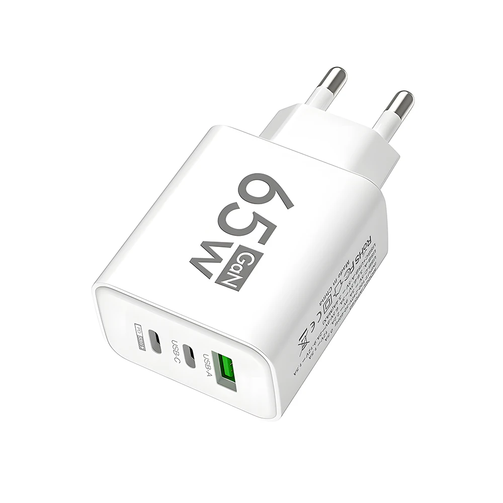 A charger with 2 Type C ports and a 2.0 USB, slow charging (65w)