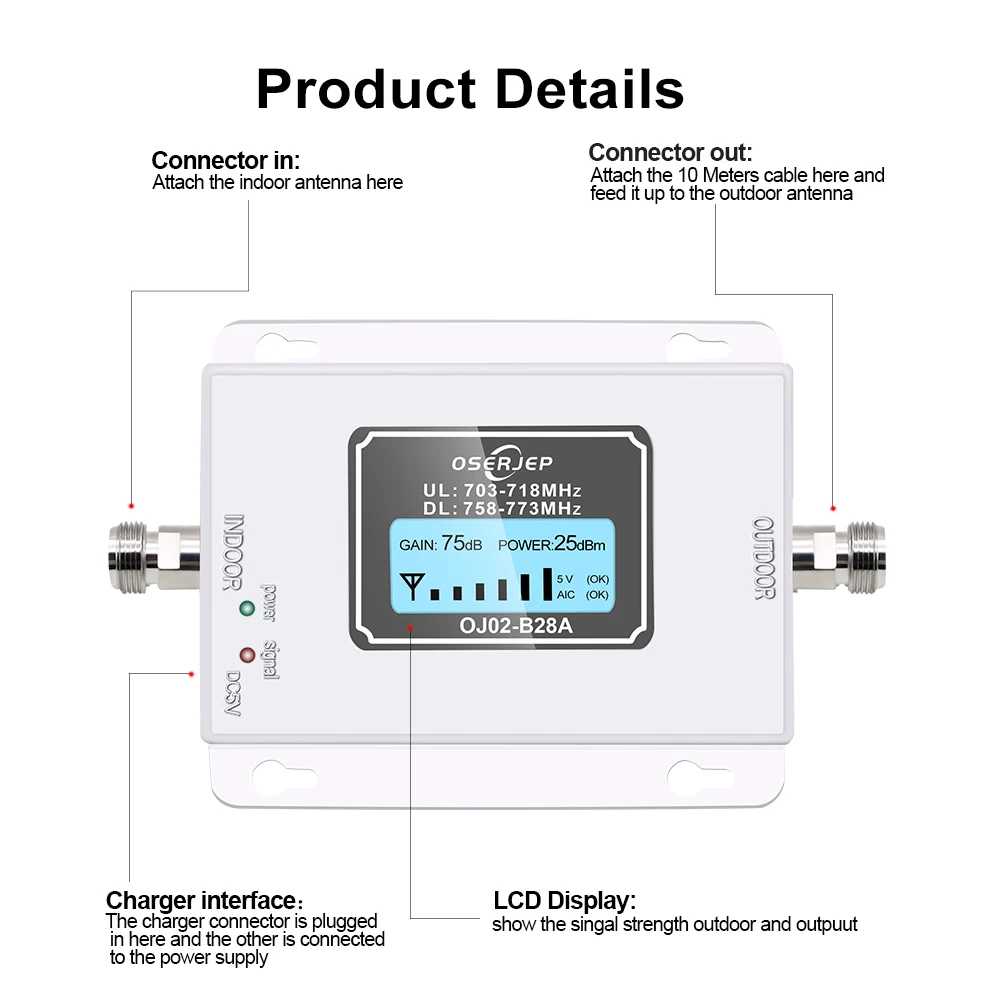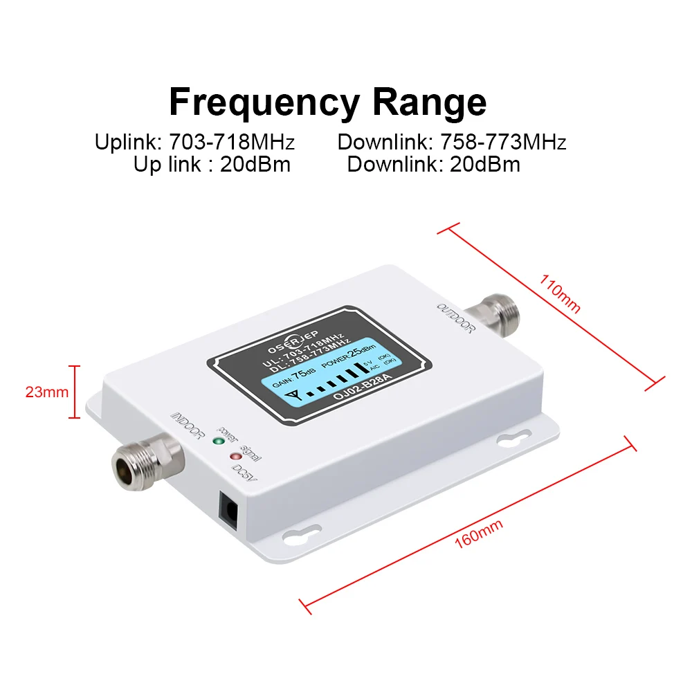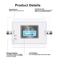 Repeater Gain: 70dB (the LCD might show 75dB, but the actual gain of this item is 70dBm)