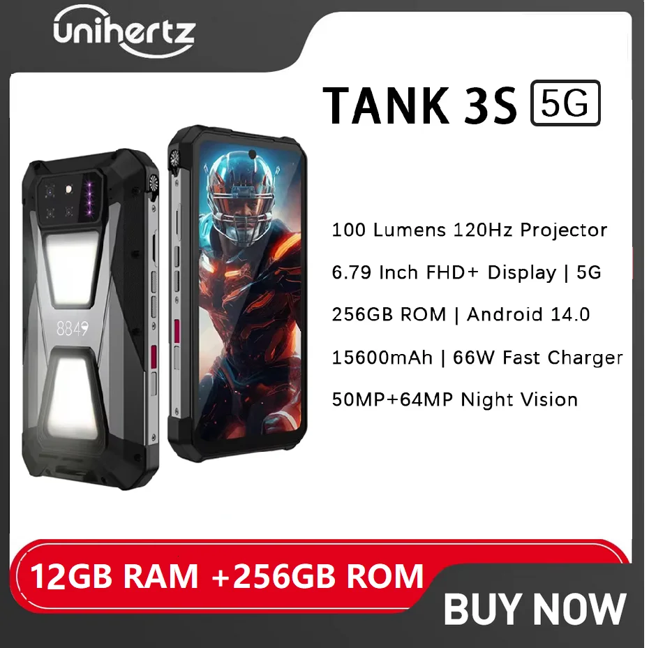 8849 Tank 3S Unihertz Rugged Phone with Projector 12GB RAM 256GB ROM 15600mAh 64MP Night Vision 66W NFC 5G Smartphone Android 14