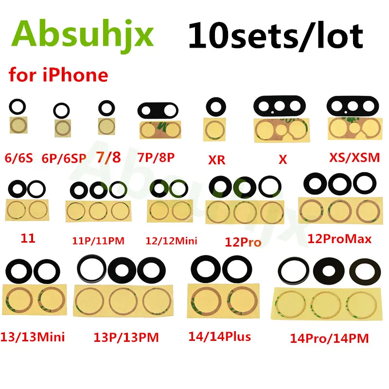 Absuhjx 10pcs Back Camera Glass for iPhone 7 8 6S Plus 11 12 13 14 Pro Max X XS XR Rear Camera Cover Lens with Adhesive Sticker