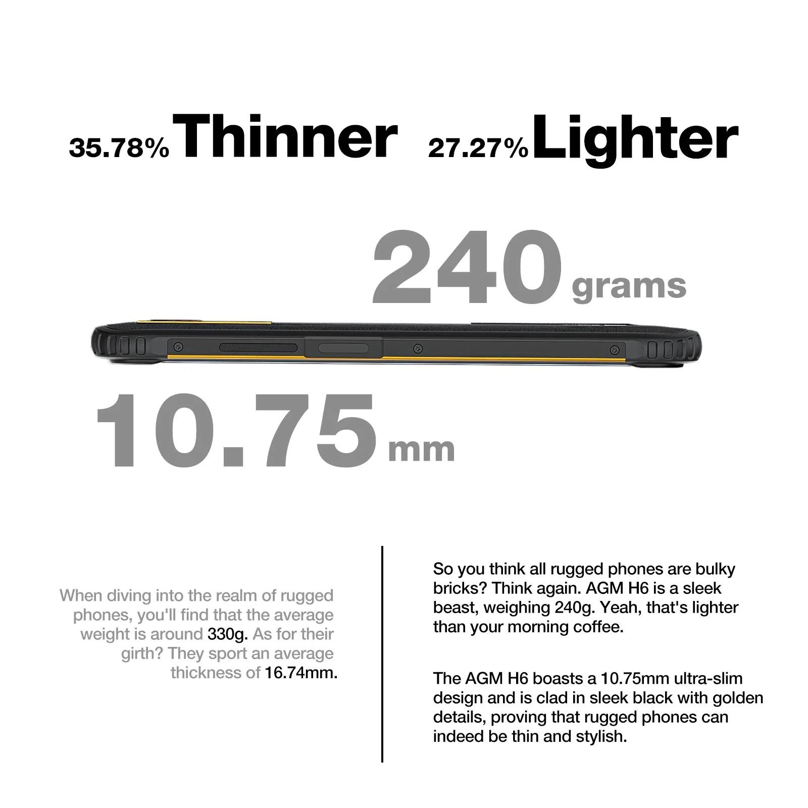 🧮【16GB RAM+256GB ROM/512GB Expansion】The AGM H6 Leather Edition rugged smartphone, available without a contract, runs on Android 13 OS and is powered by an Octa-Core T606 processor (2x A75 @ 1.6 GHz + 6x A55 @ 1.6 GHz). It boasts a generous 16 GB of RAM (8 GB physical RAM + 8 GB virtual RAM) and 256 GB of ROM, expandable up to 512 GB via an SD card. This significantly enhances operational performance, making downloads and sharing a breeze. 🧮【Ultrathin and Rugged Phone】The AGM H6 rugged phone not only offers IP68/IP69K Waterproof and dust resistance, as well as MIL-STD-810H shock resistance, but it also remains unscathed even when dropped from a height of 1.8 meters. Furthermore, it is incredibly slim and lightweight, with a thickness of just 10.75 mm and a weight of only 240 grams, making it highly portable compared to traditional work smartphones. 🧮【4G Dual SIM, NFC/Fingerprint ID, and GPS+Beidou+Galileo】The AGM H6 4G Sim-free&Unlocked mobile phone supports 3 card slots, including 2 nano SIM slots and 1 TF card slot, which can be used simultaneously without the need to frequently swap cards. Additionally, the device is equipped with NFC, fingerprint and face recognition, radio, GPS, Beidou, and Galileo. 🧮【50 MP Primary Camera +8 MP Front Camera + 2 MP Macro Camera】The AGM H6 rugged smartphone 2023 is equipped with a 50MP camera, an 8 MP front camera, and a 2 MP macro camera to meet your daily photography needs. 🧮【4900 mAh Battery+18W Fast Charging】The built-in 4900 mAh battery provides up to 24 hours of talk time, 22.5 hours of music playback, 7.2 hours of web browsing, and 7.5 hours of video playback on a single charge.