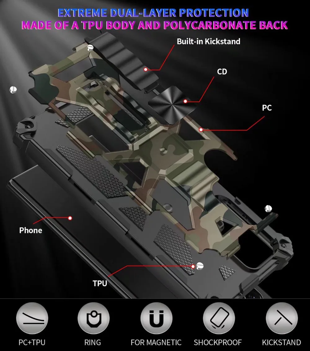 Specifications: Material: High-quality TPU with a dual-layer design Features: Anti-fingerprint, non-slip, magnetic, anti-scratch, dustproof Compatibility: Samsung Galaxy S24, S23 FE, S22 Ultra, A03S, S21 FE, S20 Plus, A32, A14, A54, A05S Design: Camouflage pattern with a built-in kickstand Functionality: Enhanced protection and convenience with a magnetic closure Features: |Samsung A S22|Samsung A03s For Sale|S20 Ultra Case| **Enhanced Protection and Style** The Armor Kickstand TPU Case is a testament to durability and style, crafted from a robust TPU material that offers dual-layer protection against drops and impacts. The camouflage pattern not only adds a unique touch to your device but also provides a secure grip, preventing slips and falls. The magnetic closure ensures your phone stays securely in place, while the built-in kickstand allows for hands-free viewing, making it ideal for watching videos or participating in video calls. **Versatile Compatibility and Functionality** This case is designed to fit a wide range of Samsung devices, including the S22 Ultra, S21 Ultra, and S20 Plus, ensuring a perfect fit for your device. The magnetic features are not only limited to the closure but also extend to the case's compatibility with magnetic accessories, such as car mounts or charging stands. The anti-scratch and dustproof properties keep your device pristine, while the anti-fingerprint finish maintains a clean look throughout the day. **Convenience Meets Durability** The Armor Kickstand TPU Case is not just about protection; it's about convenience. The case's design allows for easy access to all buttons and ports, ensuring that your device remains fully functional while encased. Whether you're an outdoor adventurer or a busy professional, this case is the perfect companion for your Samsung Galaxy. It's the ultimate blend of durability and functionality, making it a must-have accessory for anyone who values both their phone and their lifestyle.