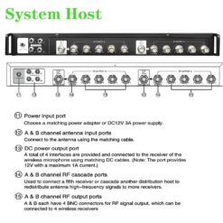 6.Two 50ohms BNC antenna cascade ports can connect an additional distribution host or a fifth wireless receiver.Each
