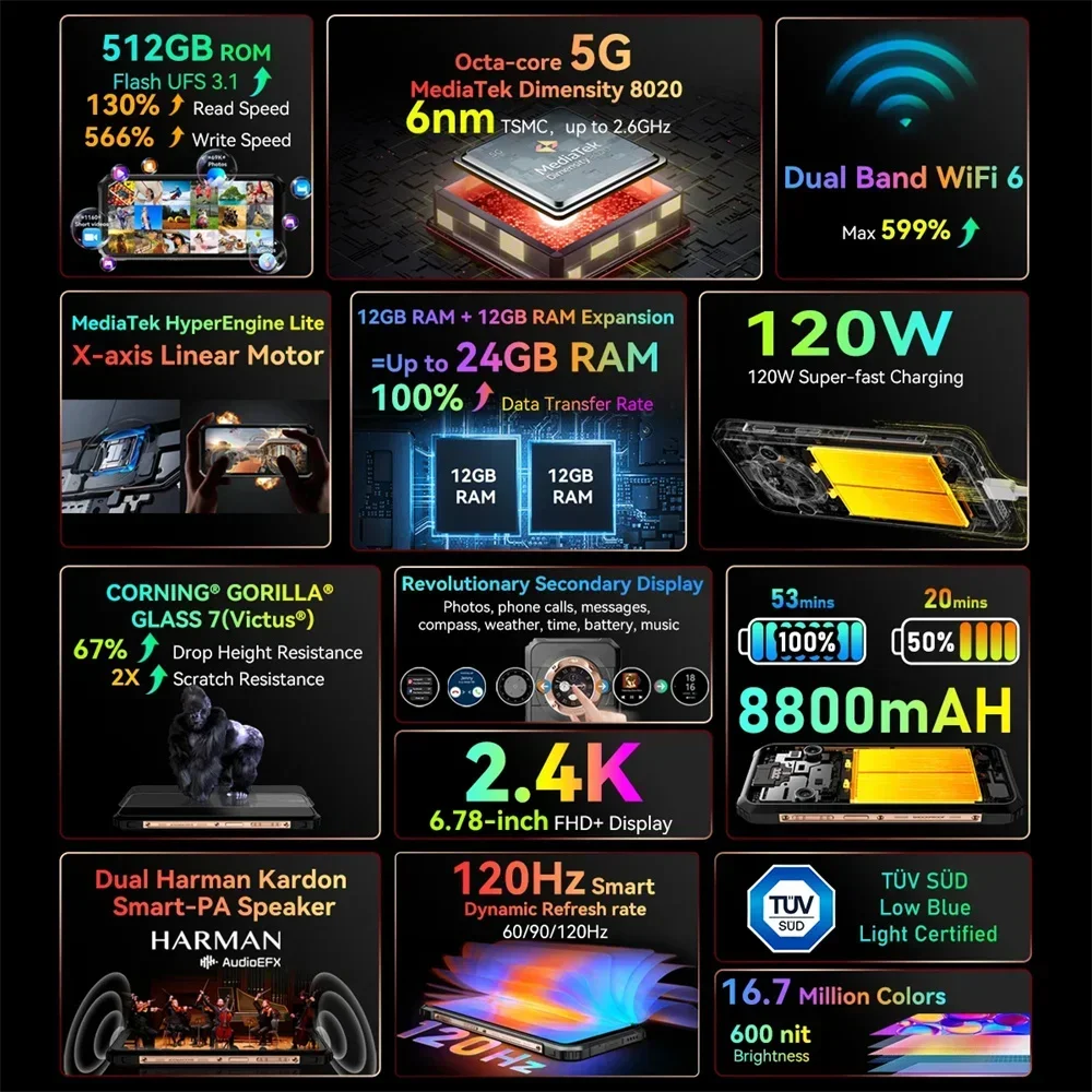 Blackview BL9000 Rugged 5G Smartphone 6.78Inch 2.4K Screen Octa Core 12GB+512GB Android 13 Mobile Phone 8800mAh 120W Fast Charge