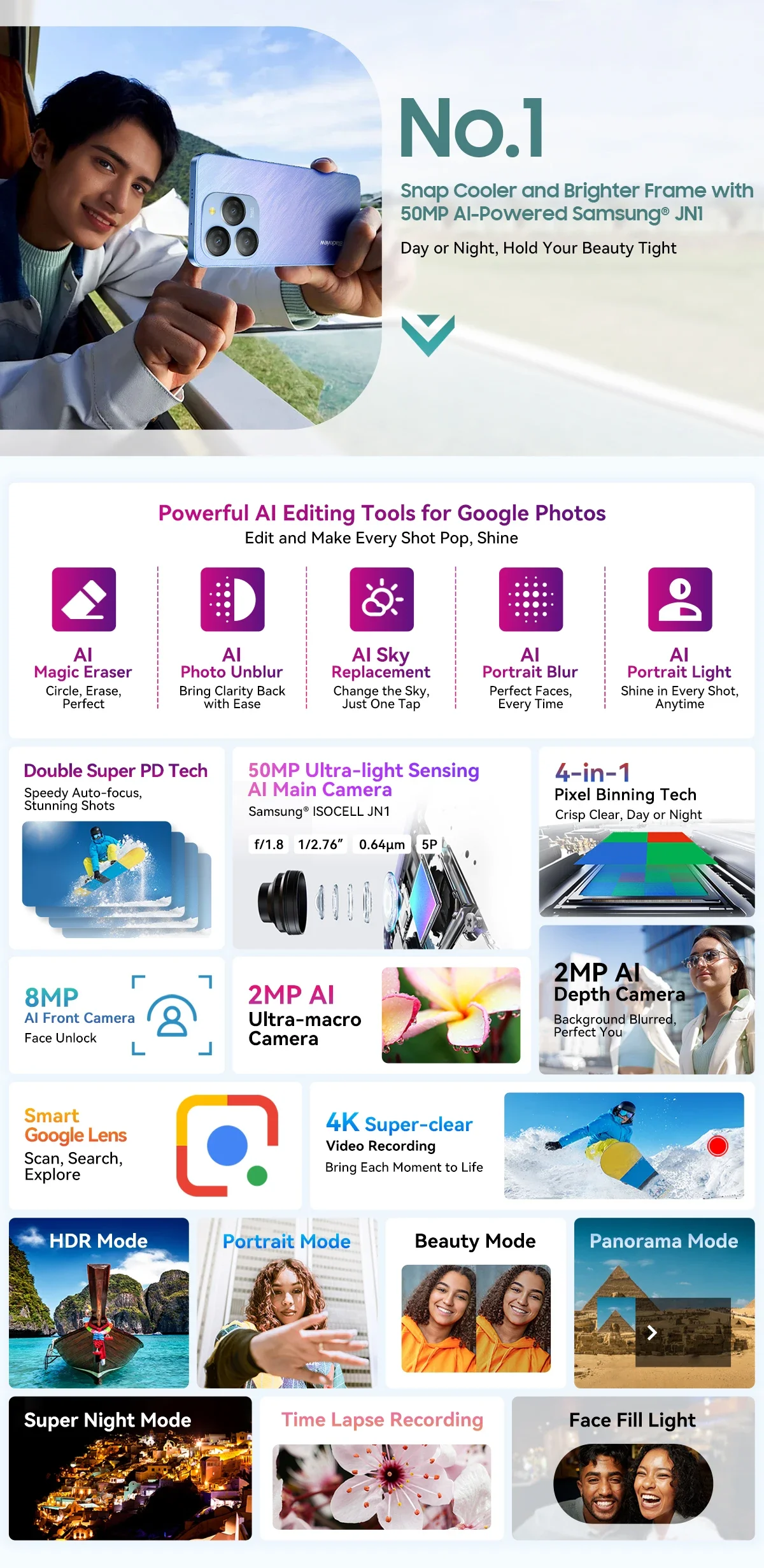 50MP Ultra-Light Sensing AI Main CameraSamsung® ISOCELL JN1