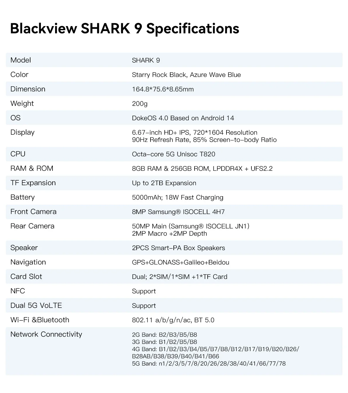 Blackview SHARK 9 5G Smartphone 6.67” HD+ 90Hz Display Android 14 Octa Core 8GB+256GB 50MP AI Camera 5000mAh 18W Cellphone NFC