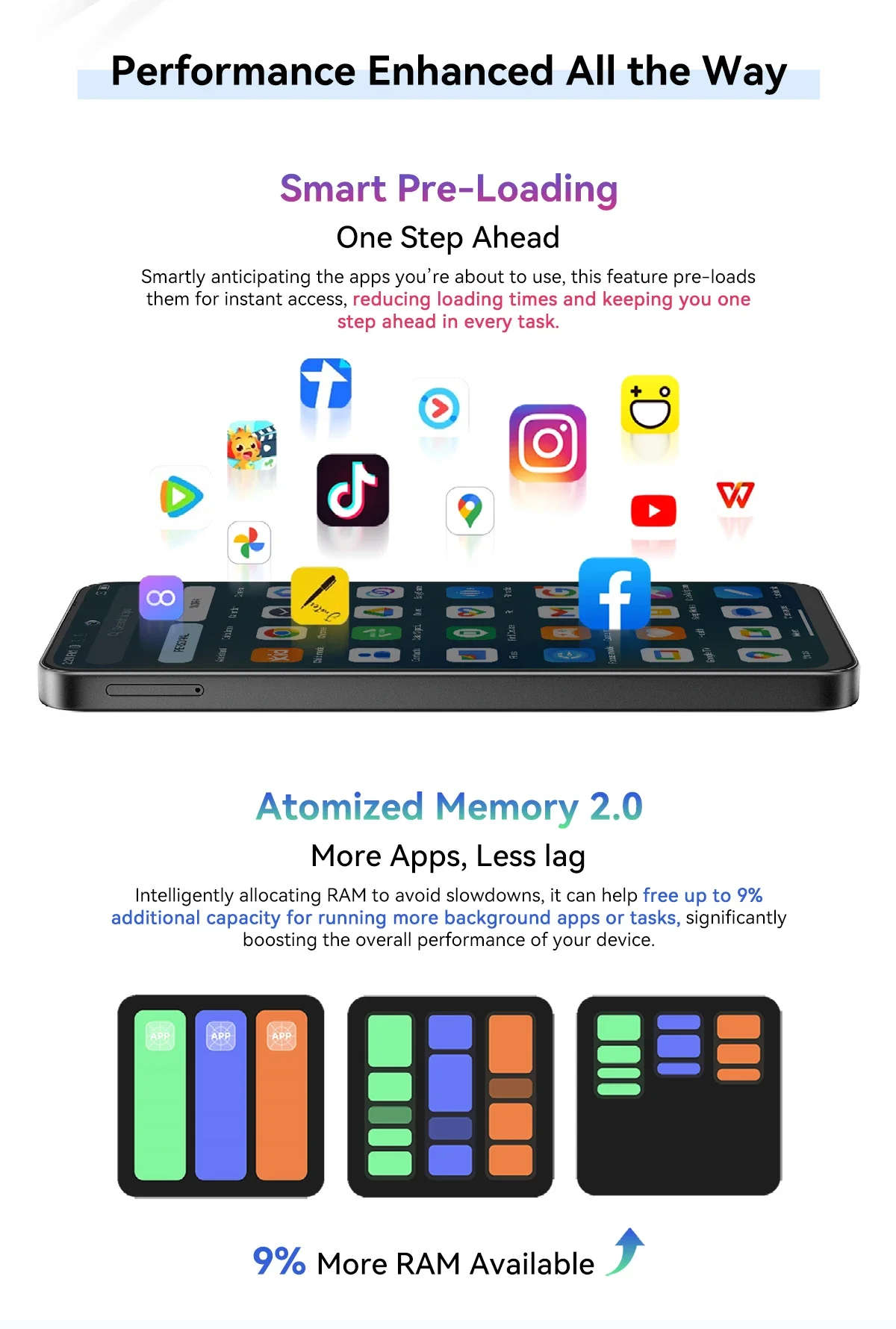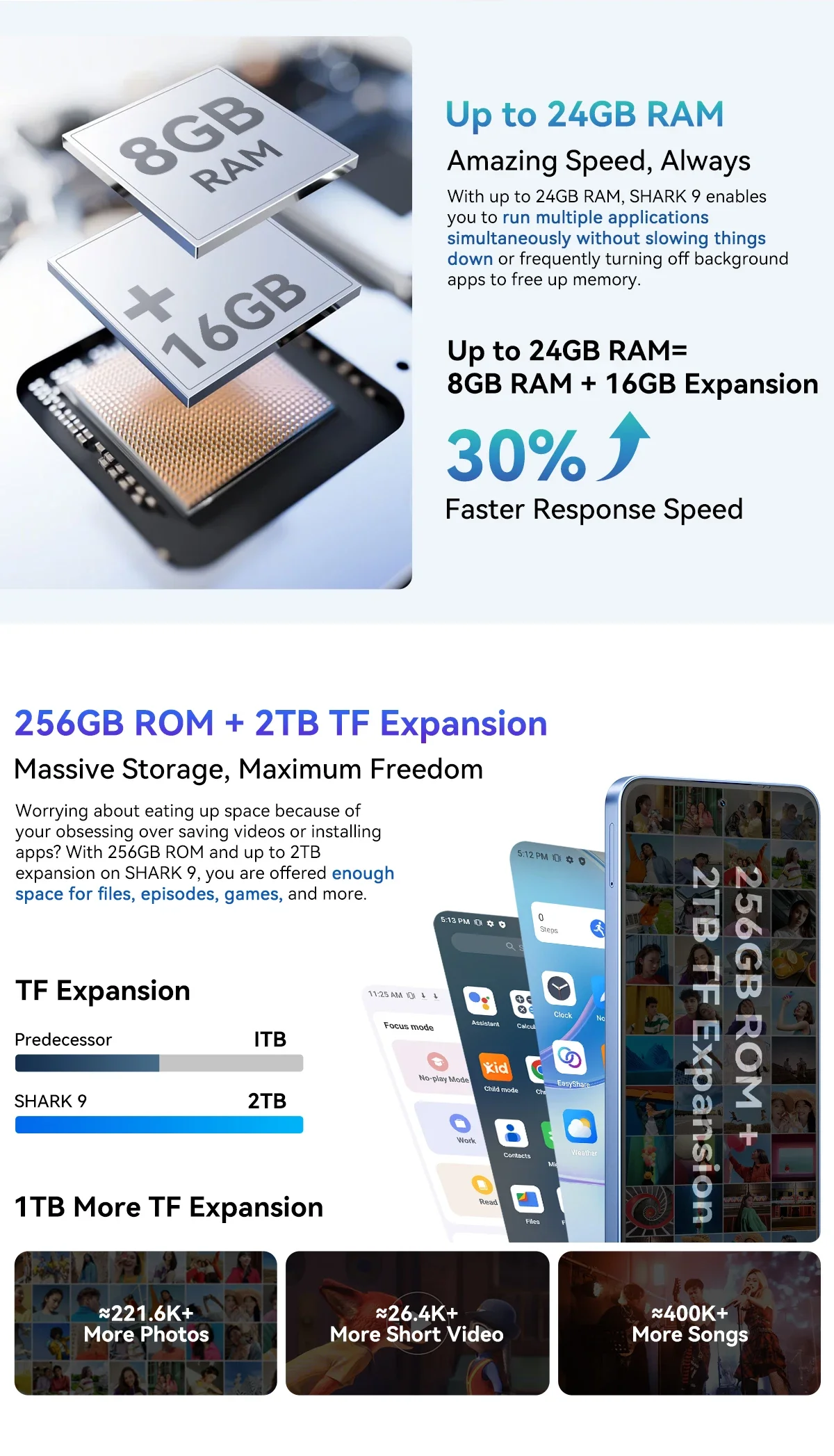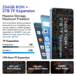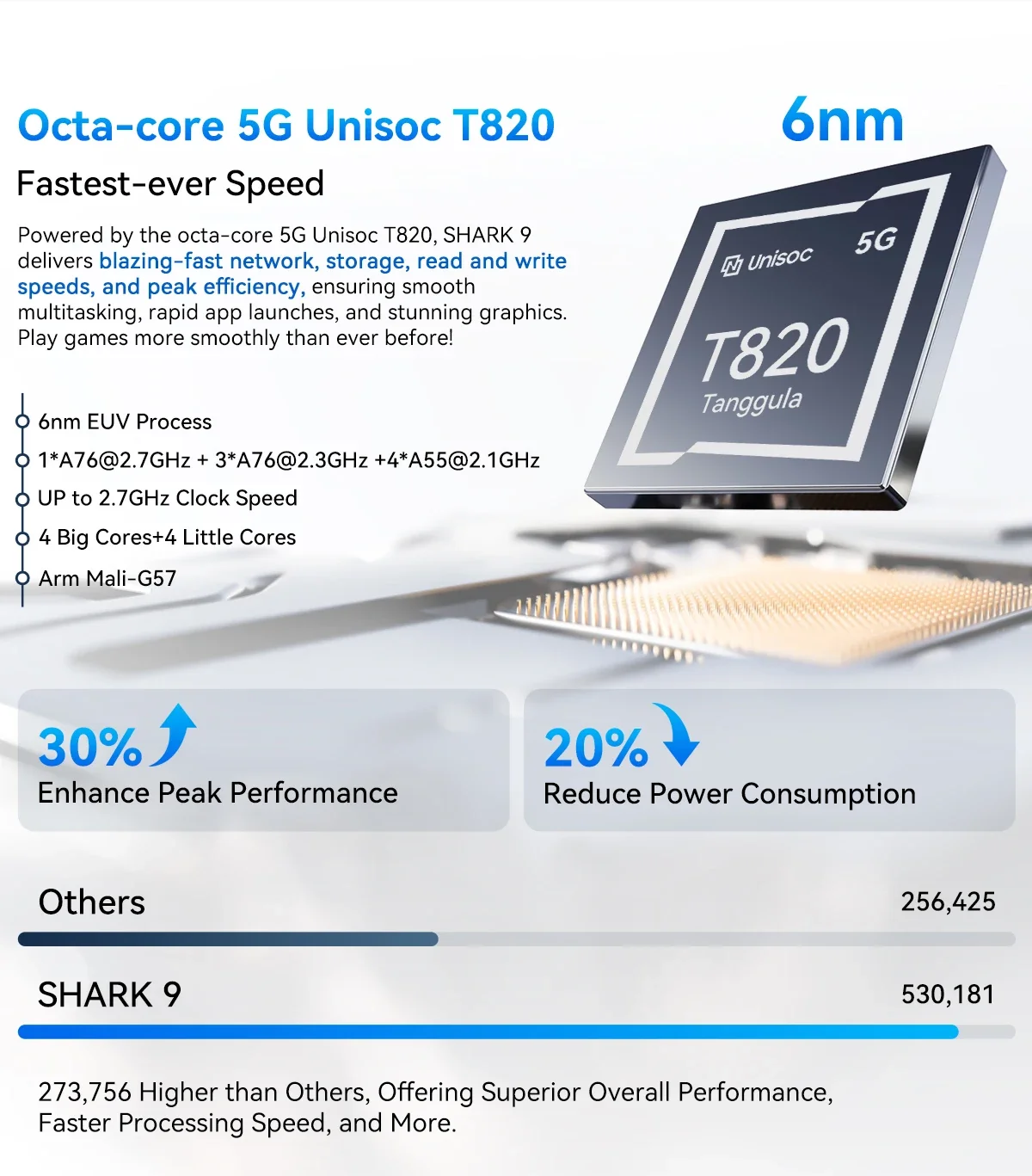Powered by the octa-core 5G Unisoc T820, SHARK 9 delivers blazing-fast network, storage, read and write speeds, and peak efficiency, ensuring smooth multitasking, rapid app launches, and stunning graphics. Play games more smoothly than ever before!