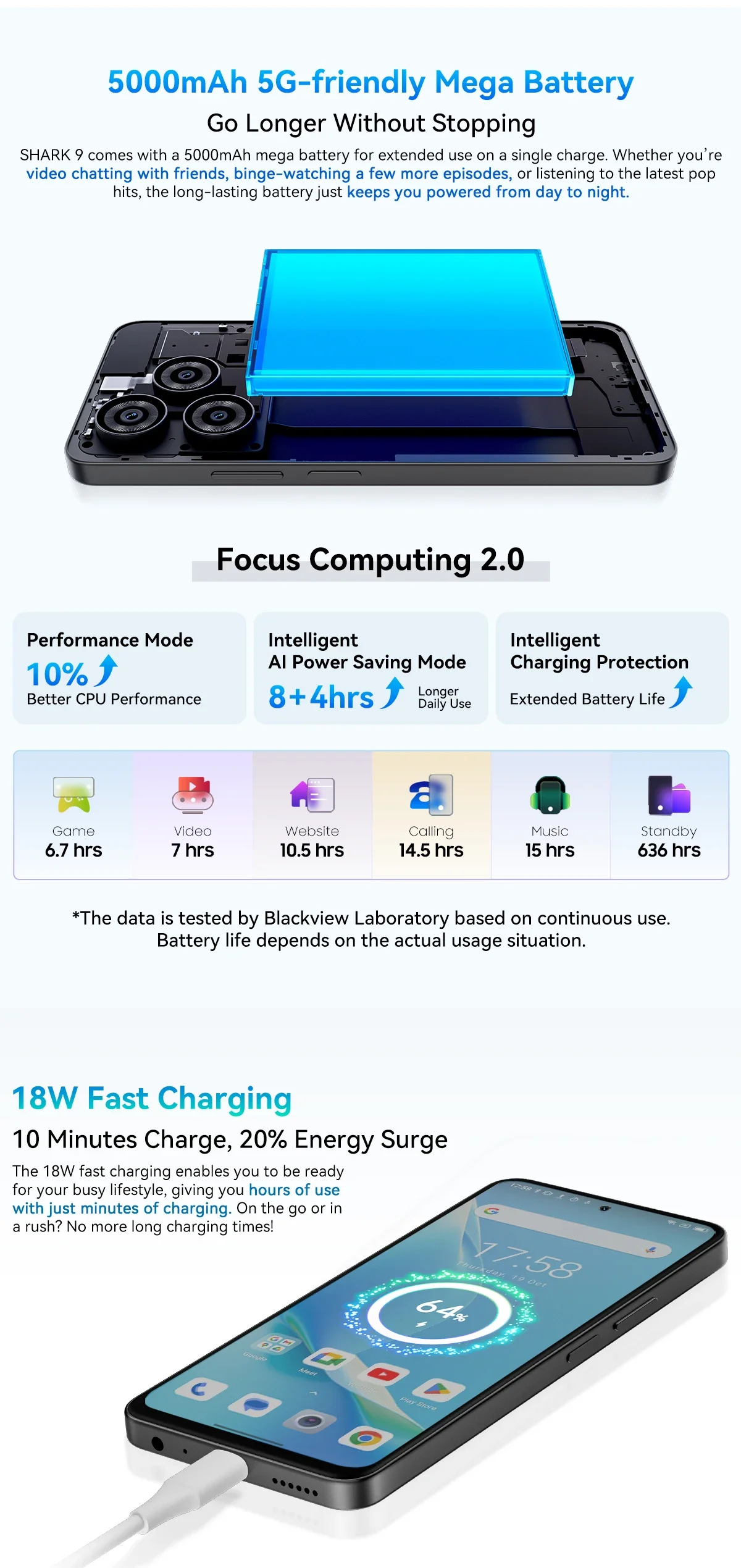 SHARK 9 comes with a 5000mAh mega battery for extended use on a single charge. Whether you’re video chatting with friends, binge-watching a few more episodes, or listening to the latest pop hits, the long-lasting battery just keeps you powered from day to night.