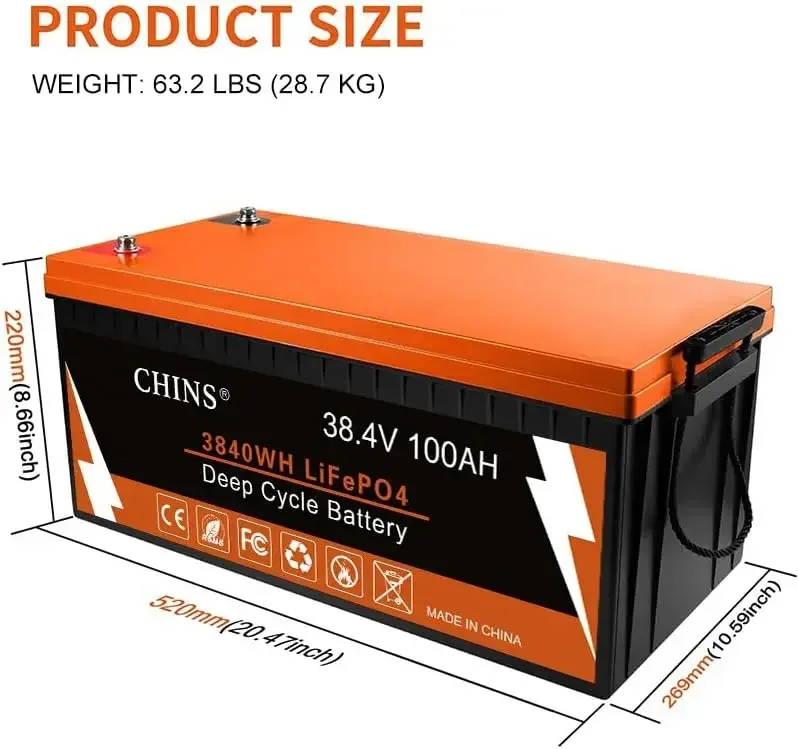 - 【Deep Cycle Battery】: CHINS LiFePO4 battery provides 2000+ cycles compared to 300~500 cycles in lead acid battery. The service life of LiFePO4 batteries is 8 to 10 times than the standard lead-acid batteries. The weight of the lithium iron phosphate battery is 30% lighter than the lead-acid battery of the same capacity. Brand: CHINS, Size: 20.47 x 10.59 x 8.66 inches, Color: Black, Orange.