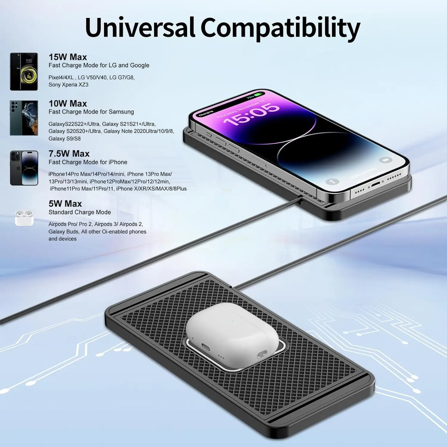 【Case Friendly & Large Compatibility wireless phone charger】- RAUGEE wireless car charger pad is able to charge through cases up to 4mm in thickness. 15W/10W/7.5W fast charging mode, the charging pad will automatically match your phones charging speed.