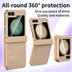 [Stylish flip experience] Z flip6’s combination of leather and gold border makes it unique to the Retro aesthetic and modern charm the smooth flip motion gives off elegance, and the auxiliary screen is enhanced with extra protection, so that time I can rest assured even when I check the notification