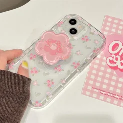 Cute Quicksand Pink Flower Holder Phone Case For iPhone 16 15 14 13 12 11 Pro Max XR X XS 7 8 Plus Stand Floral Clear Soft Cover – 509