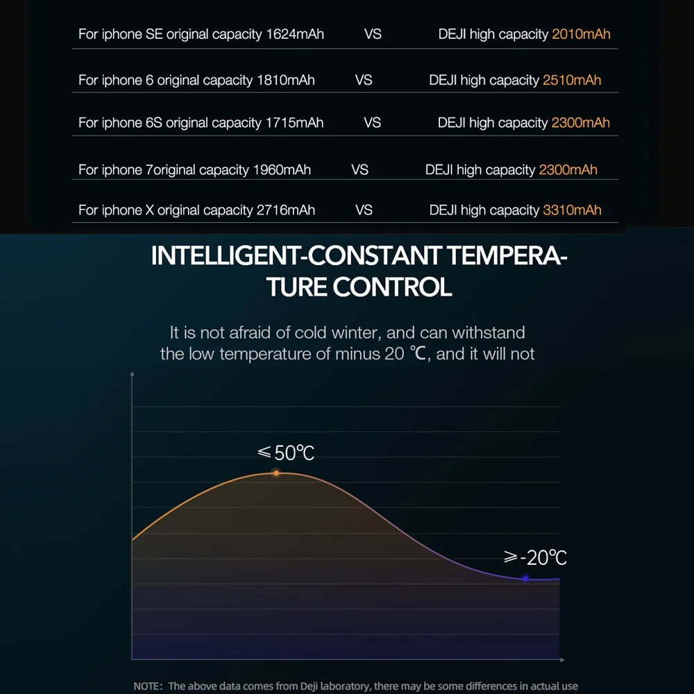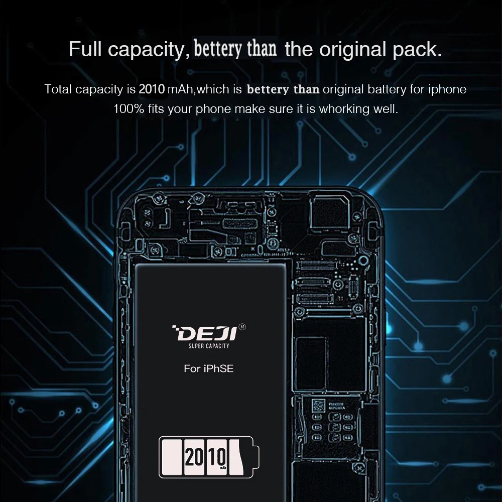 DEJI for iphone se battery 2010mah VS Original battery 1624mAh. Higher than 386mah Capacity.