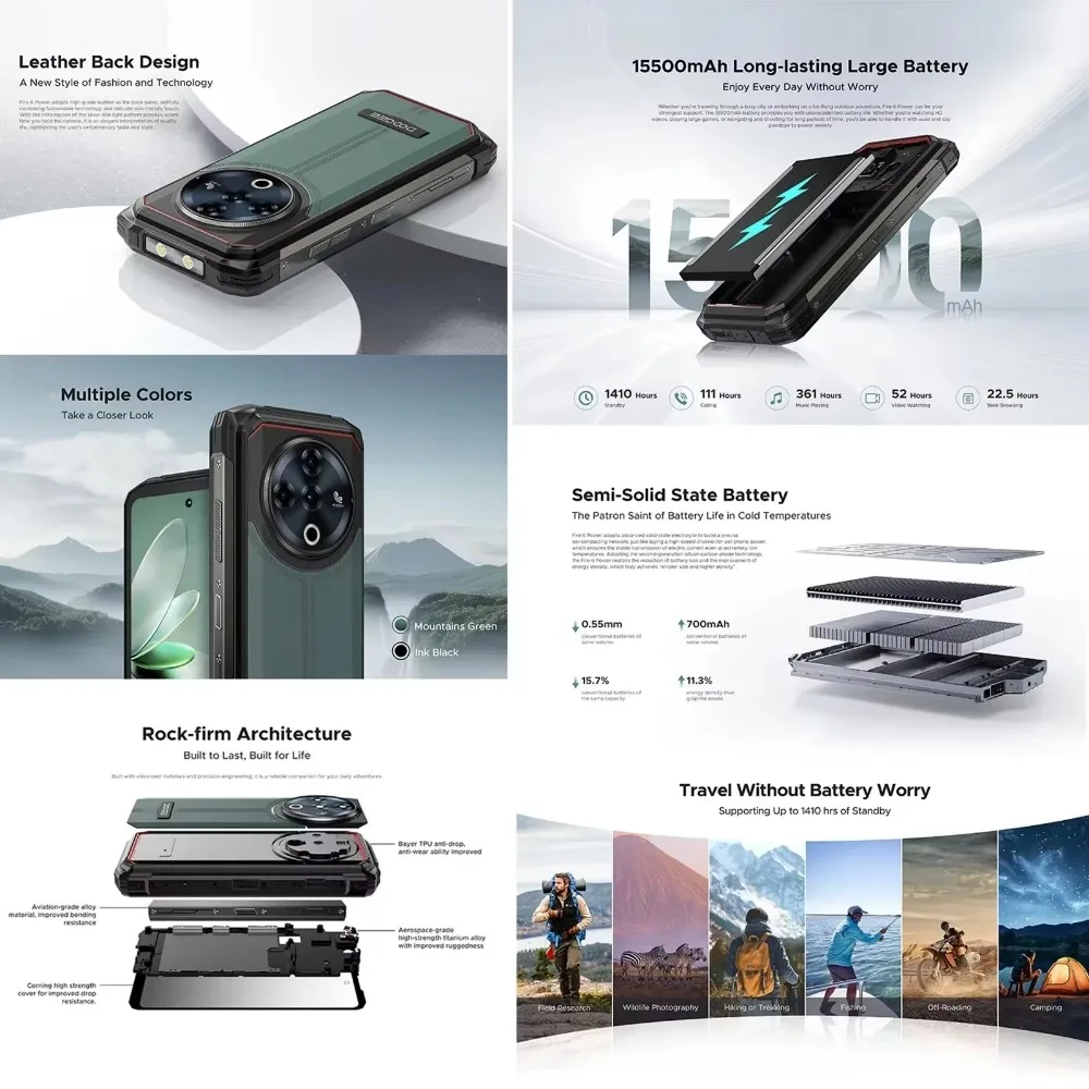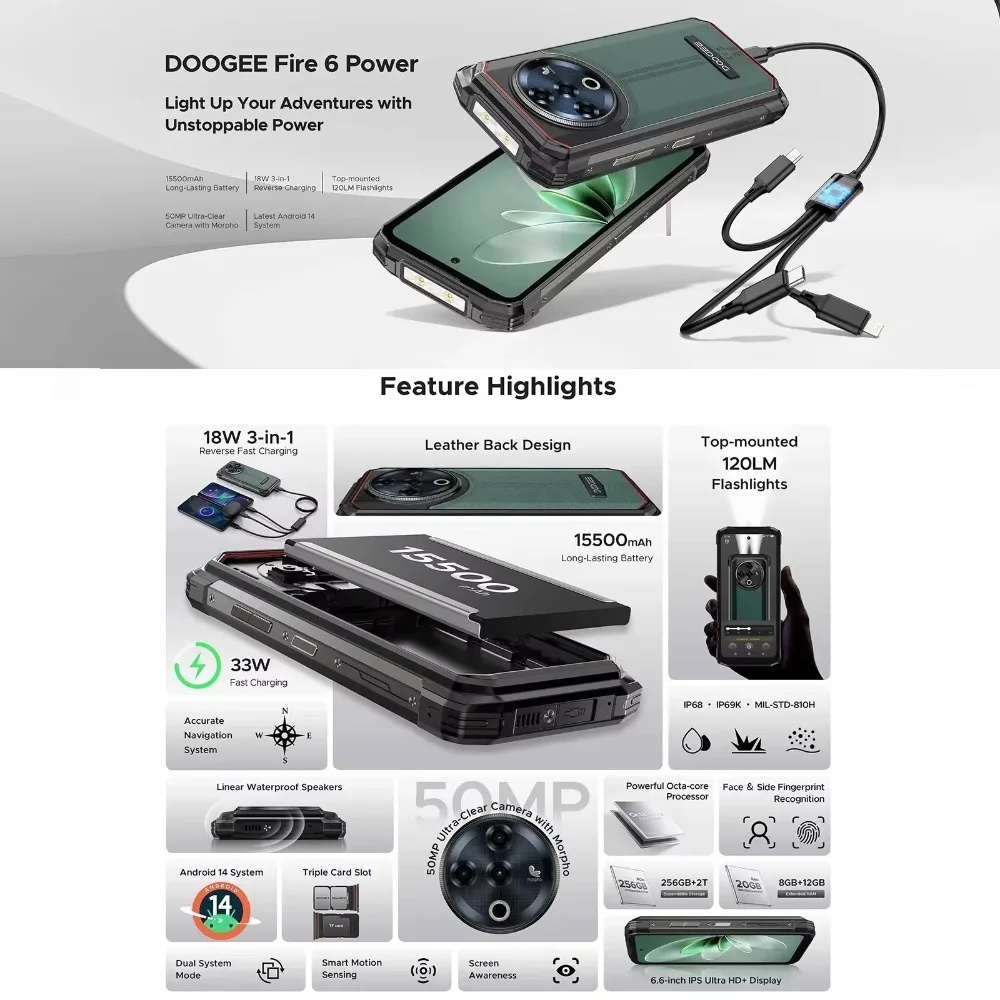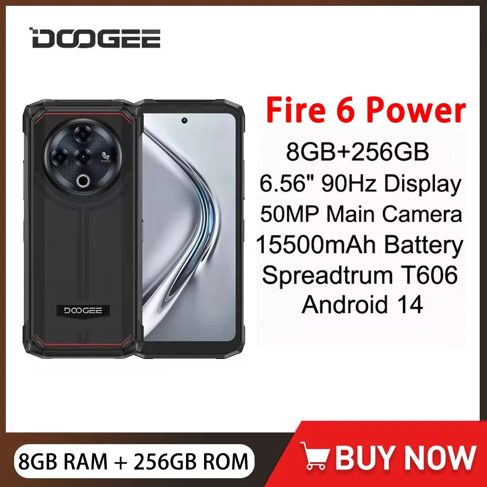 DOOGEE Fire 6 Power 4G Rugged Smartphone 6.56 Inch 90Hz Display 8GB+256GB 15500mAh 50MP Camera Spreadtrum T606 Android 14 NFC