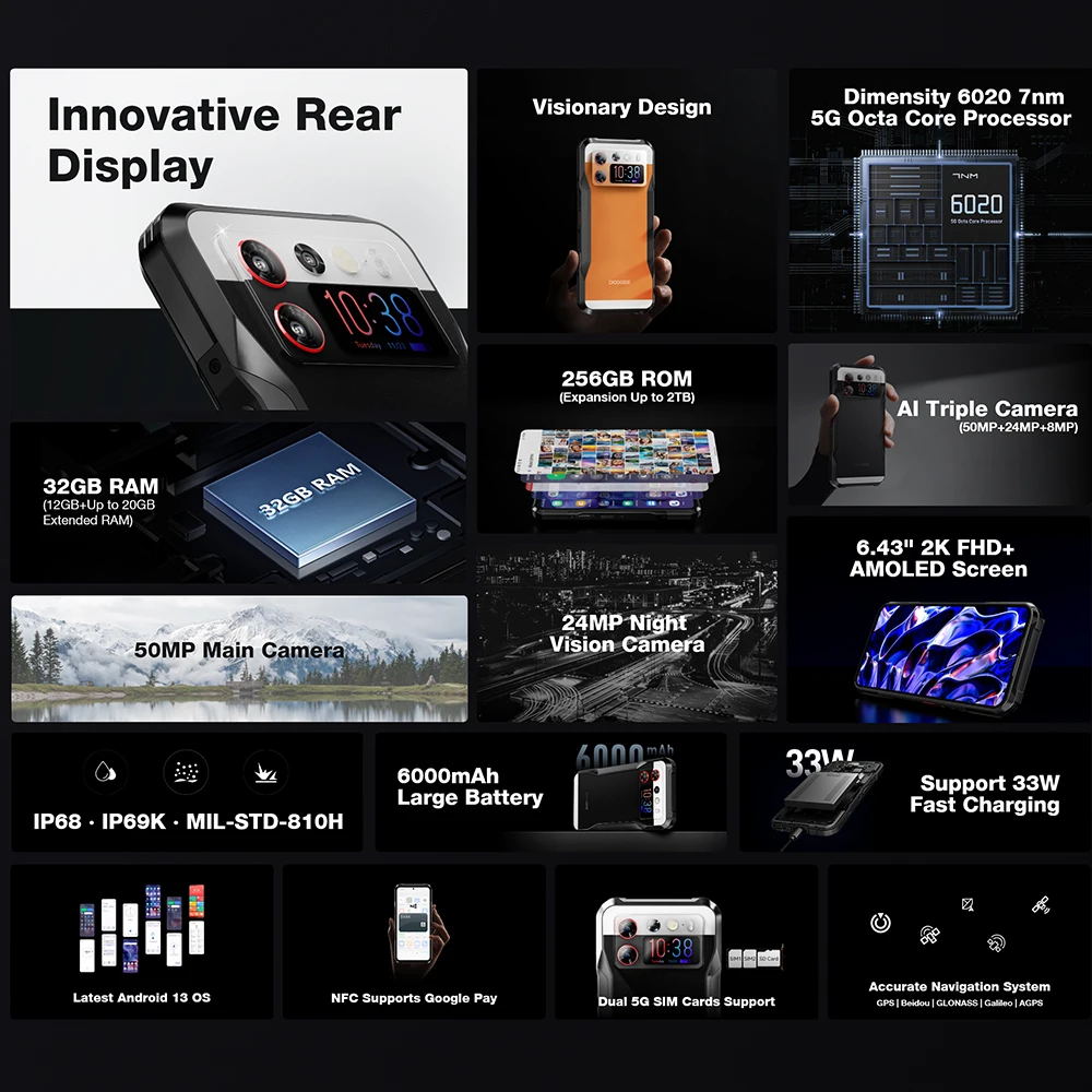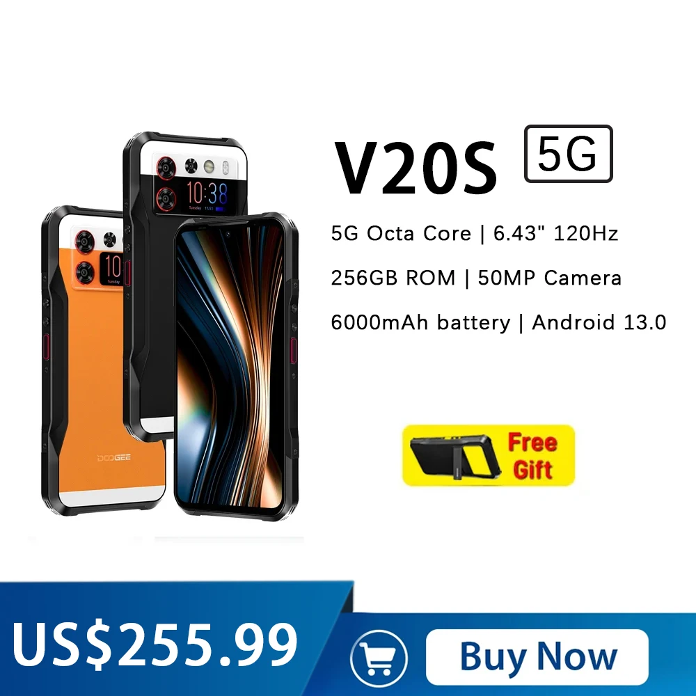 DOOGEE V20S 5G Rugged Phone 12GB+256GB Octa Core 6.43 Inch 2K FHD+ AMOLED Screen 50MP AI Triple Camera Smartphone Android 13 NFC