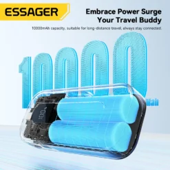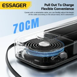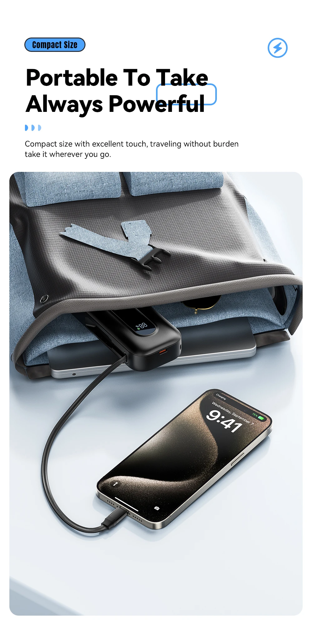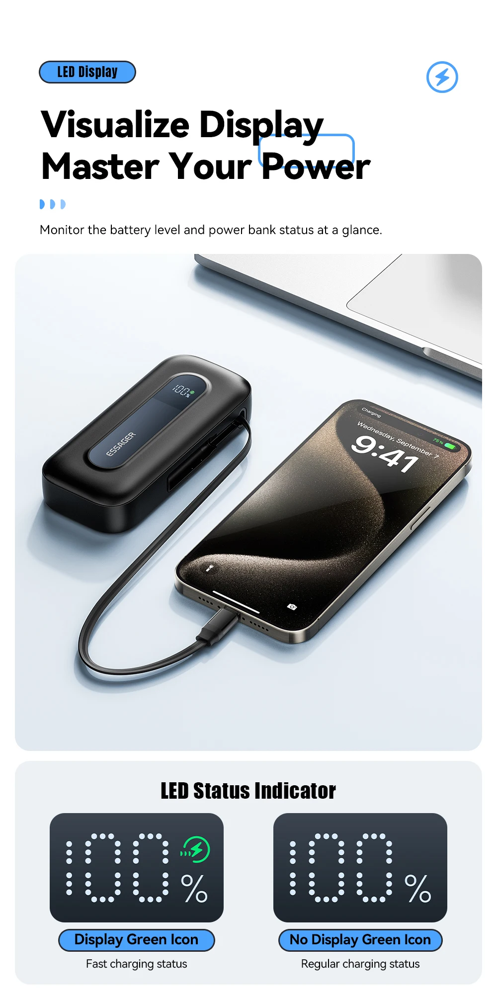 Essager 20W Power Bank 10000mAh with Built-in Retractable Type-C Cable PD Fast Charging for iPhone 16 15Pro iPad Digital Display – 509