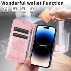 Wallet design,with slots for card and cash;Easily turn to be a support for watching videos.