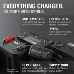 - Do more with Genius – Designed for 6-volt and 12-volt sealed lead-acid automotive, marine, RV, powersport, and deep-cycle batteries, including flooded, gel, AGM, SLA, VRLA and maintenance-free, plus lithium-ion batteries (lifepo4).