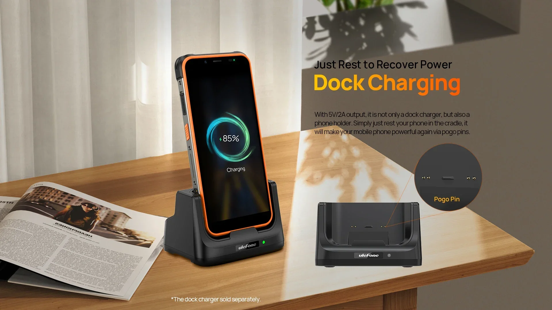 With 5V/2A output, it is not only a dock charger, but also a phone holder. Simply just rest your phone in the cradle, it will make your mobile phone powerful again via pogo pins.