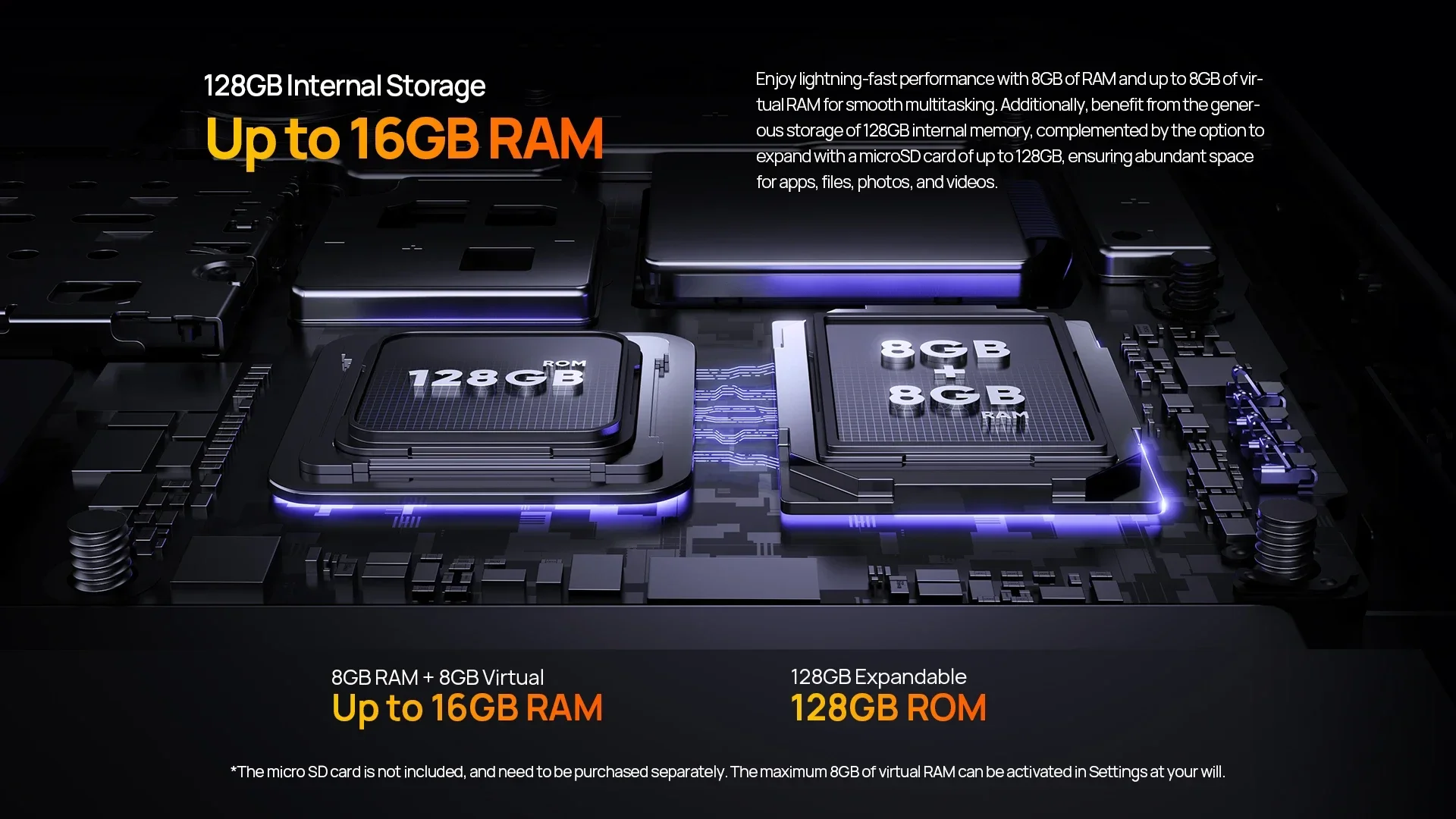 - Up to 16GB RAM =8GB RAM + 8GB Virtual , 128GB ROM