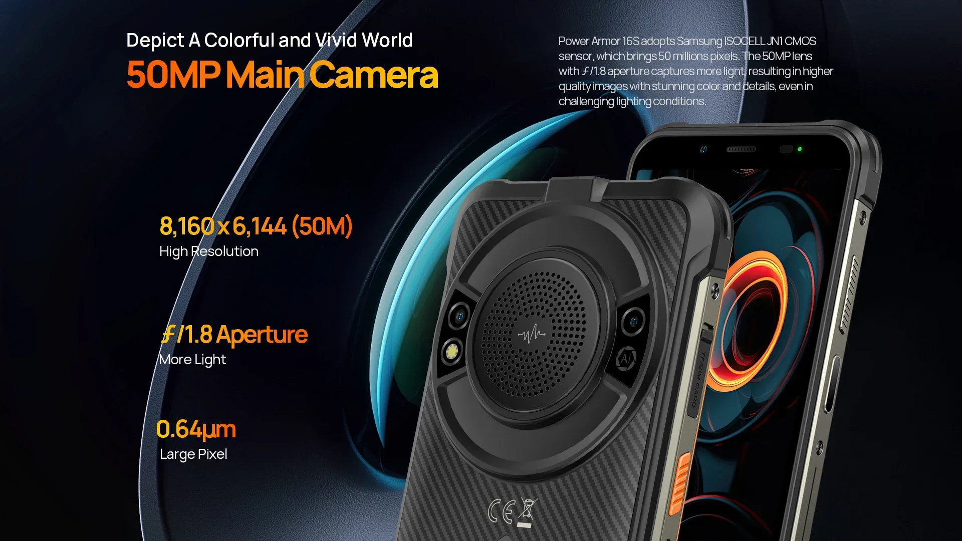 Power Armor 16S adopts Samsung ISOCELL JN1 CMOS sensor, which brings 50 millions pixels. The 50MP lens with ƒ/1.8 aperture captures more light, resulting in higher quality images with stunning color and details, even in challenging lighting conditions.