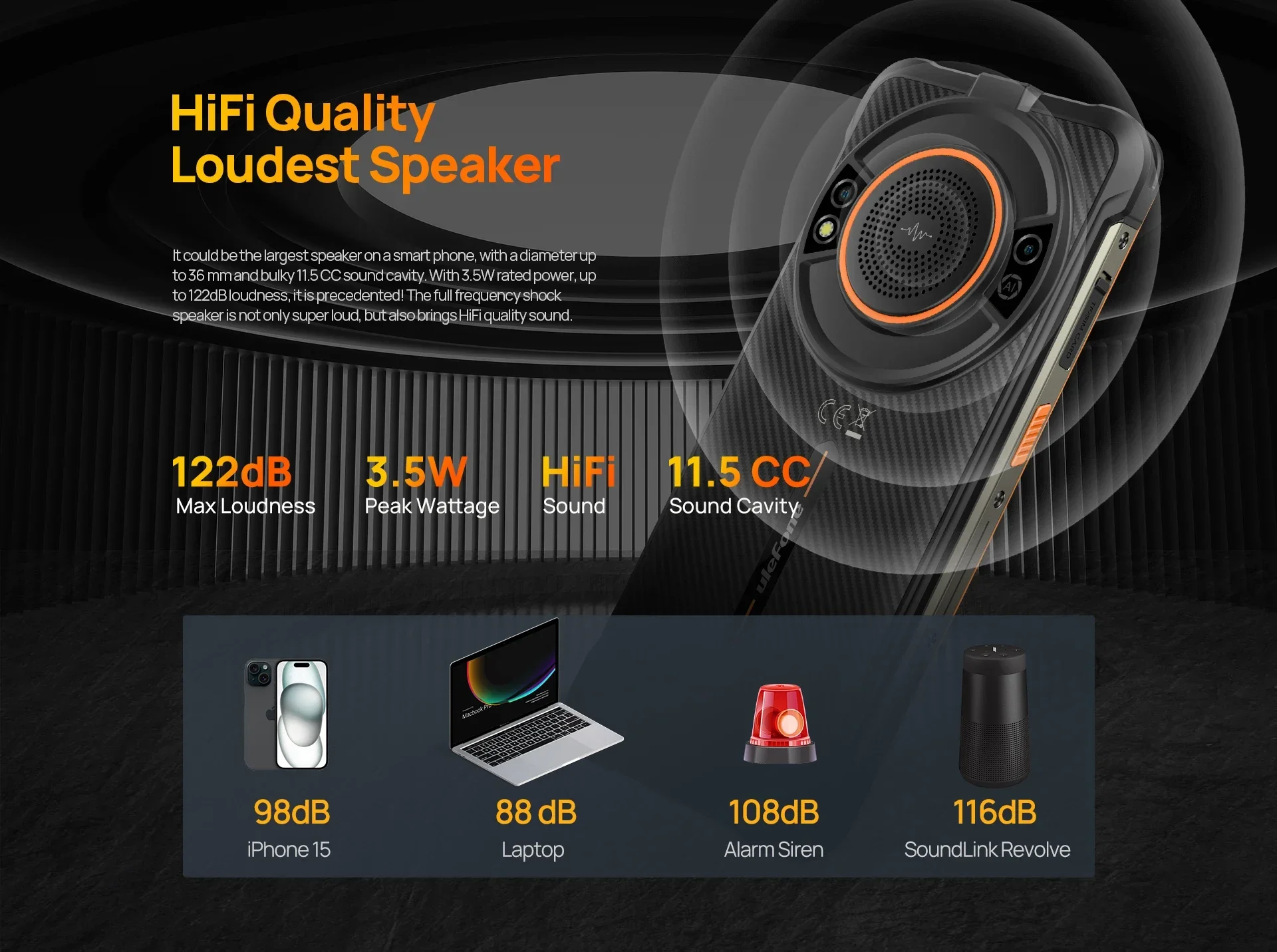 It could be the largest speaker on a smart phone, with a diameter up to 36 mm and bulky 11.5 CC sound cavity. With 3.5W rated power, up to 122dB loudness, it is precedented! The full frequency shock speaker is not only super loud, but also brings HiFi quality sound.