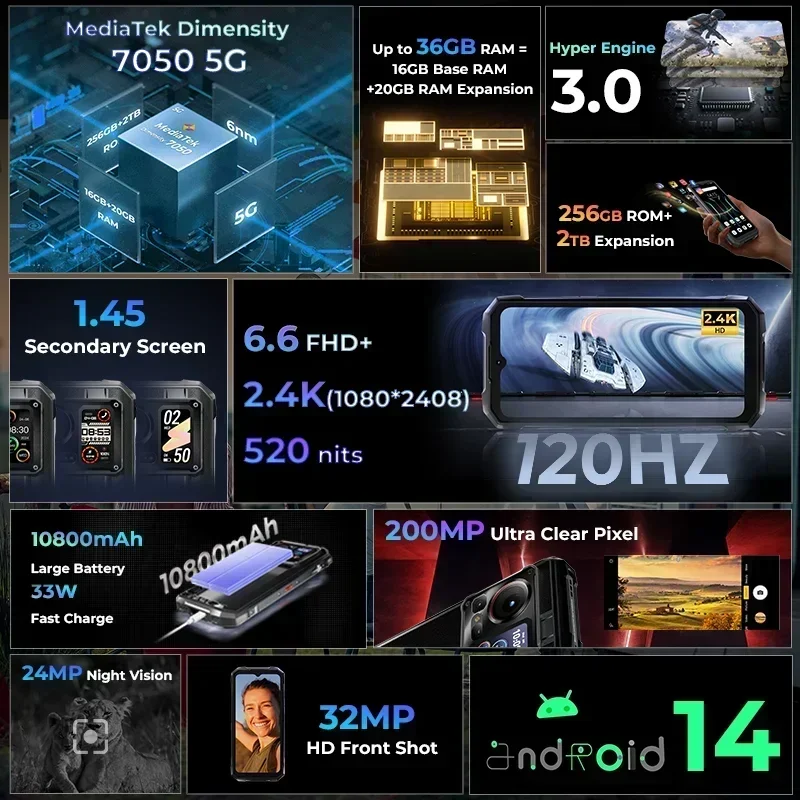 HOTWAV Hyper 7 Pro 5G Rugged Smartphone Dimensity 7050 6.6” FHD+ 120Hz 16GB+256GB Mobile Phone 10800mAh 200MP 33W NFC Cellphone