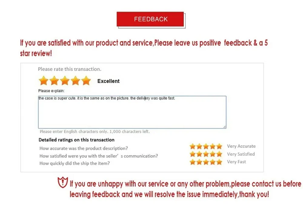 5.We are glad to solve your problem.Please do not open disputes before contact us and give below five-star feeback.Your evaluation will be recorded by the platform and shared with other sellers.The bad credit evaluation may lead you to be blacklisted by merchants and affect your shopping.