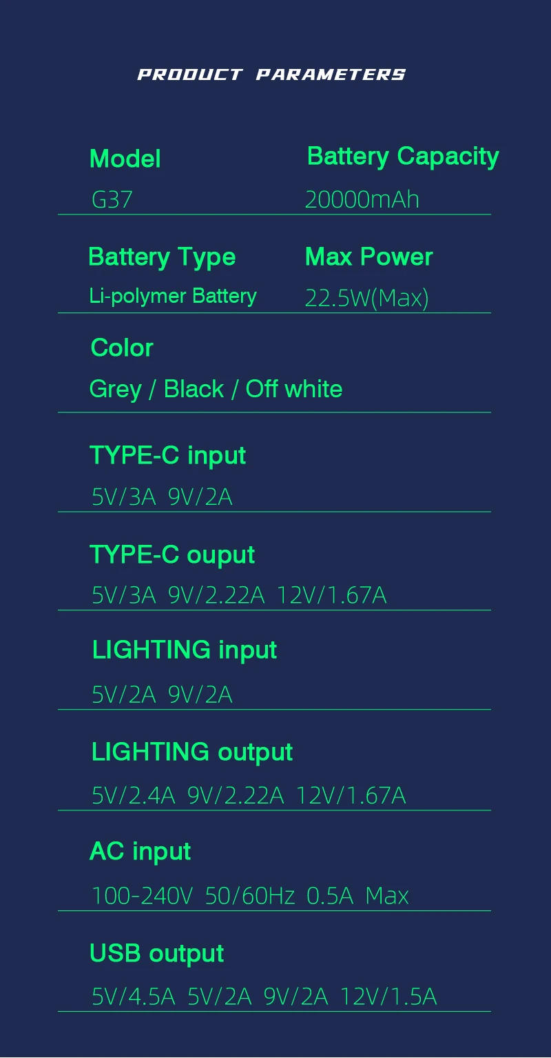 USB output: 5V/4.5A, 5V/3A, 9V/2A, 12V/1.5A