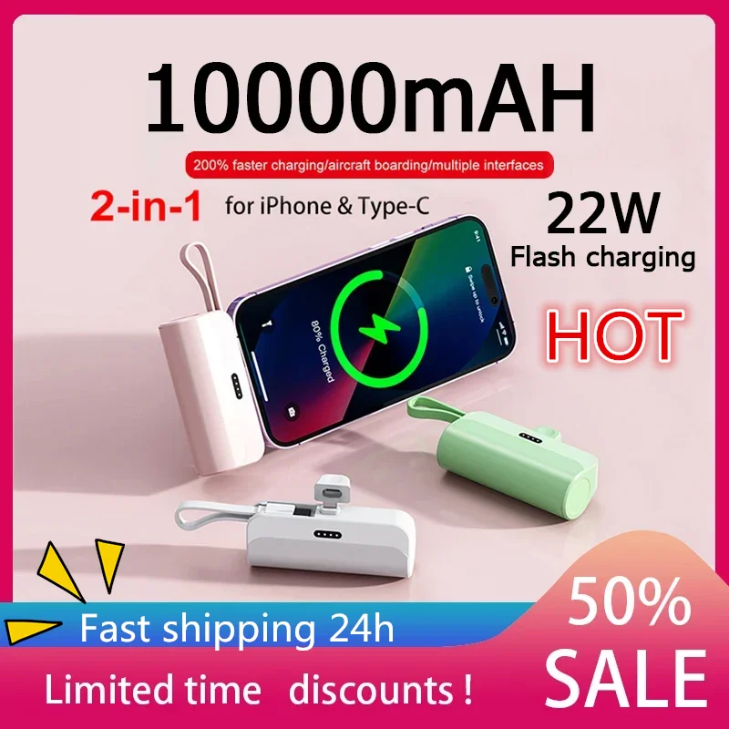 10000mAh Mini Portable Power Bank 2 in 1External Battery Plug Play Power Bank Type C Fast Effective Charger For IPhone Huawei