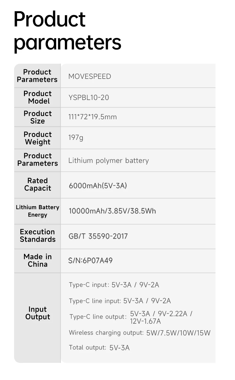 Rated Capacity: 6000mAh(5V-3A)Lithium