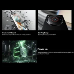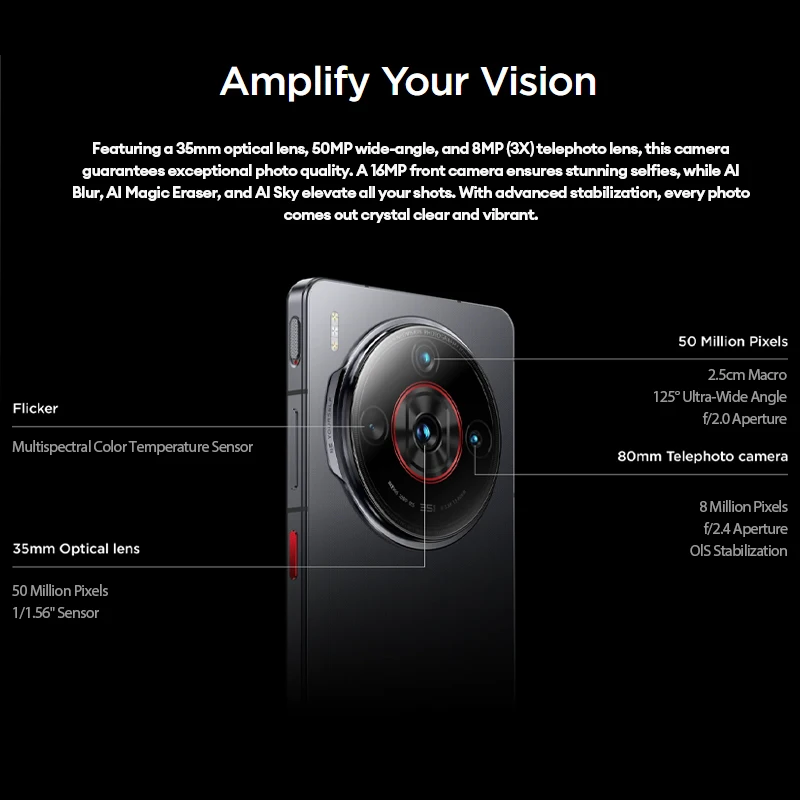 >Camera — Rear camera:50M(35mm IMX906 OIS,1/1.56inch 1.0um, 4in1,1G+6P F/1.59,QPD)+50MUltra-Wide Angle(AF,OV50D,2.5cm,DFOV=120.4°,125°,13mm) +8M (3X,Hynix847 1/4.4inch 1.0um pixel size 5P F/2.4,80mm) ,Flicker