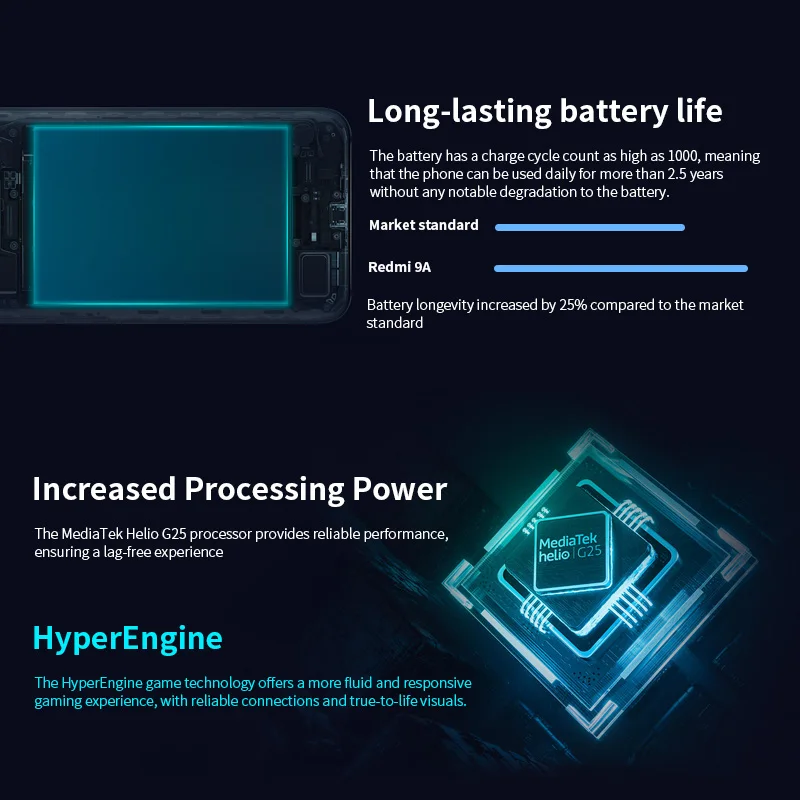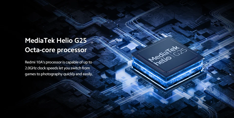 Redmi 10A’s processor is capable of up to 2.0GHz clock speeds let you switch from games to photography quickly and easily.
