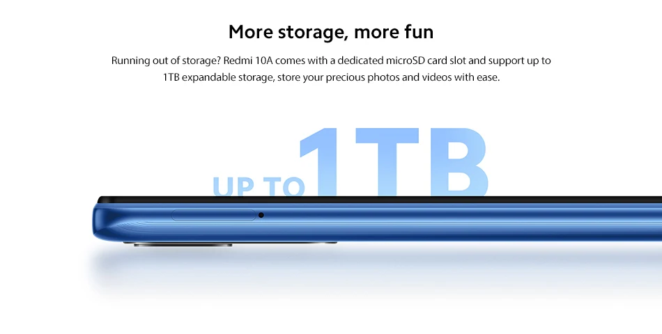 Running out of storage? Redmi 10A comes with a dedicated microSD card slot and support up to 1TB expandable storage, store your precious photos and videos with ease.