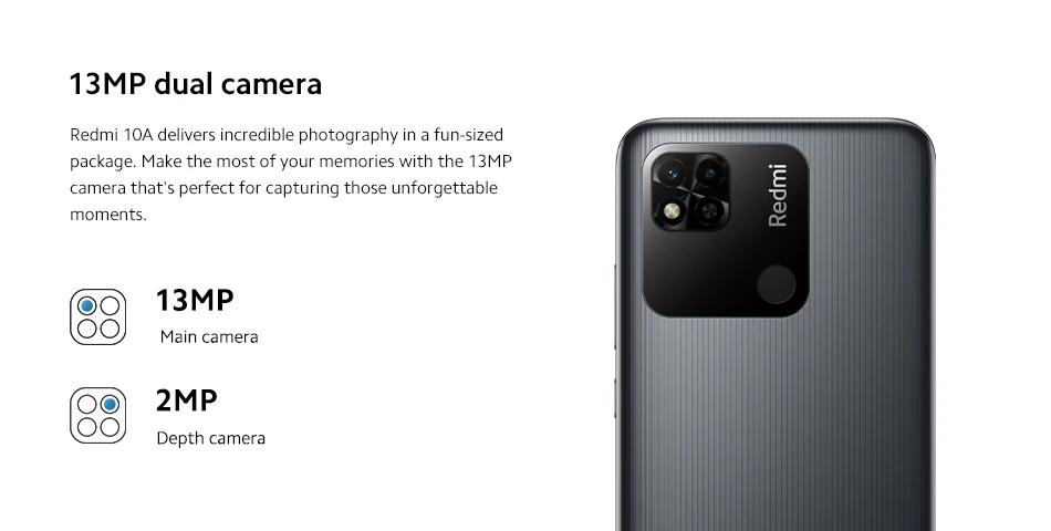 Redmi 10A delivers incredible photography in a fun-sized package. Make the most of your memories with the 13MP camera that’s perfect for capturing those unforgettable moments.